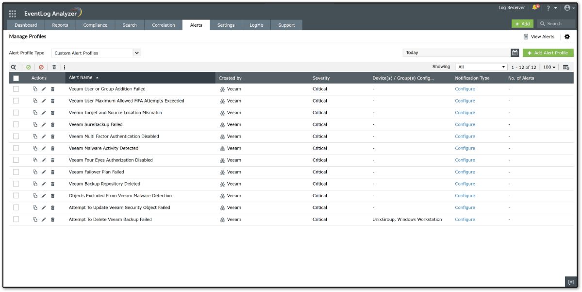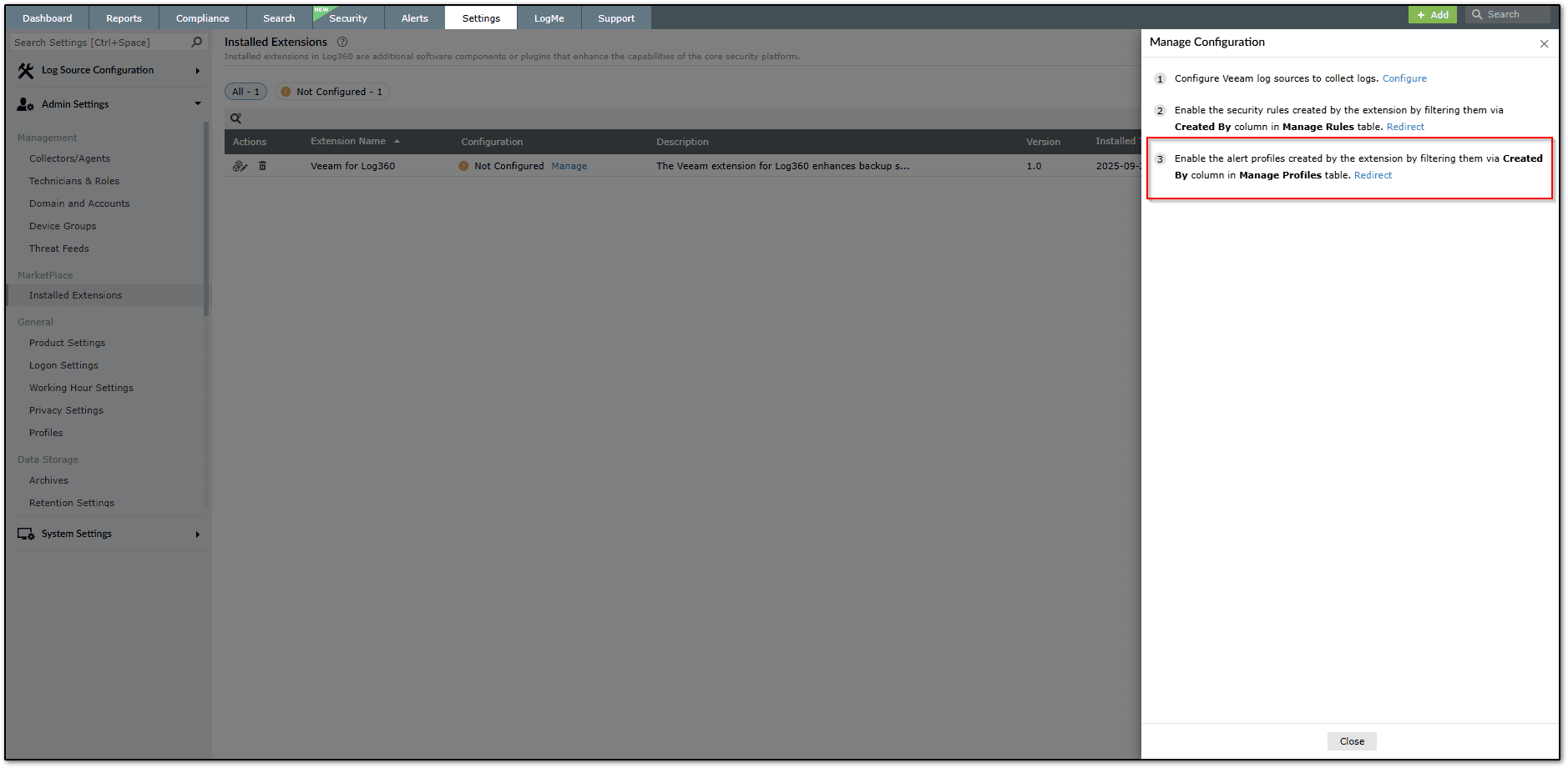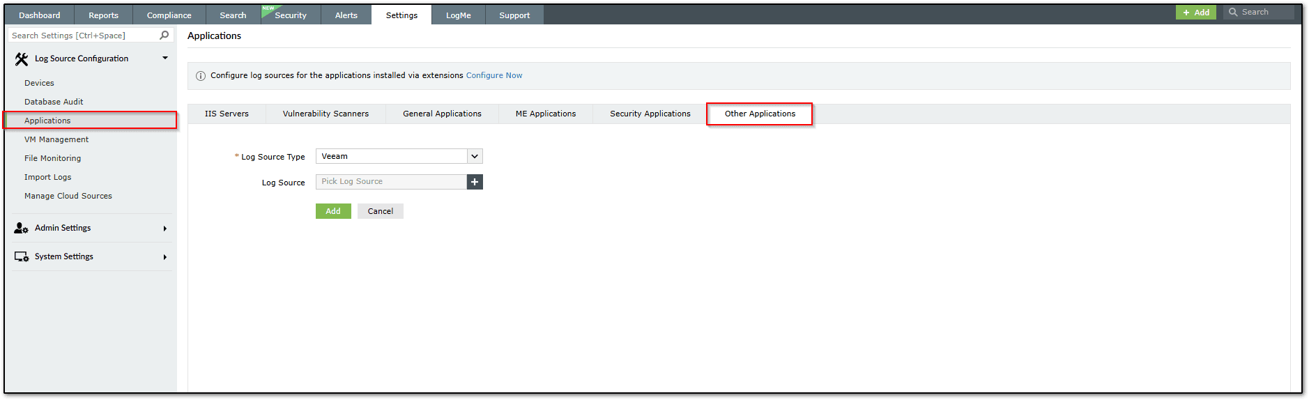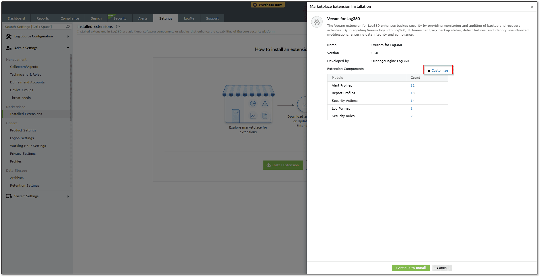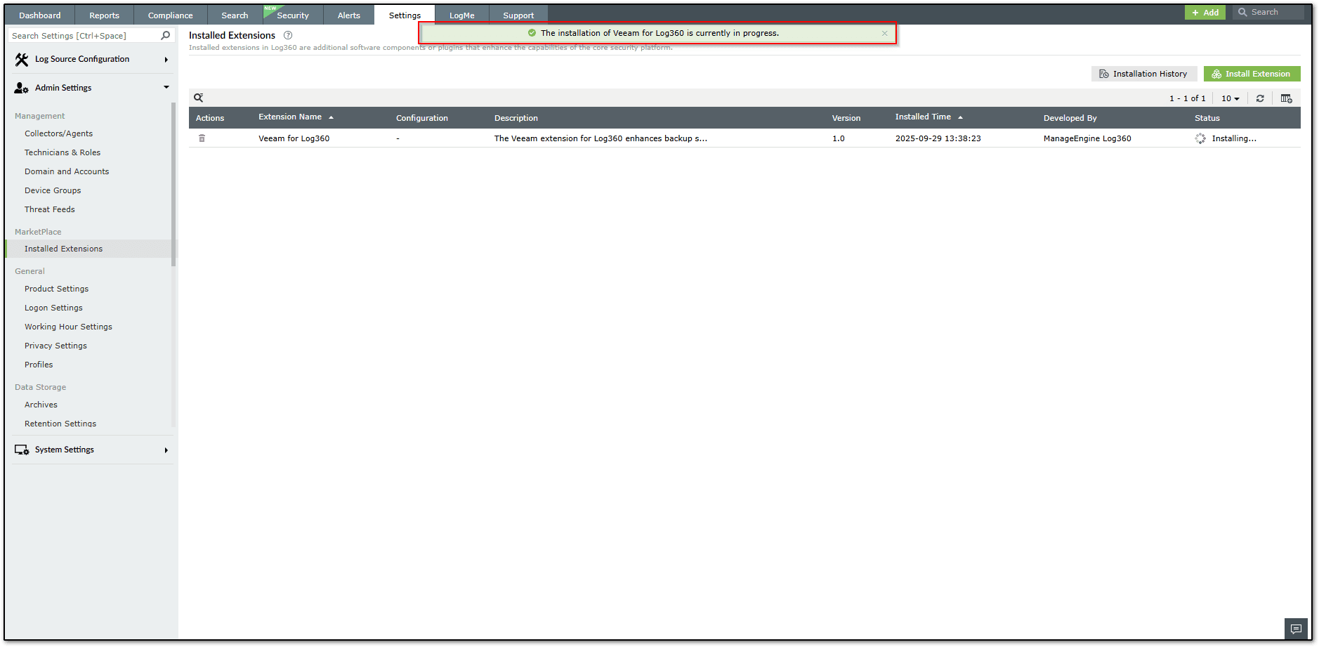 Once the extension is installed, EventLog Analyzer is now equipped with capabilities to monitor and detect Veeam log source.