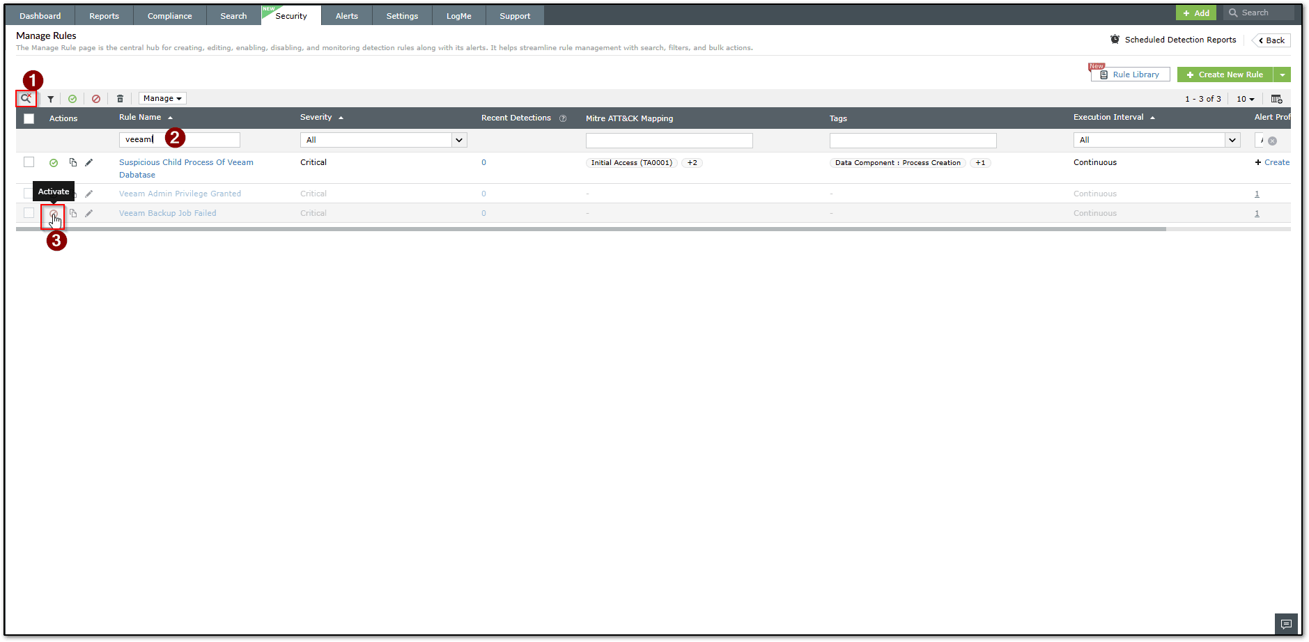 You will be redirected to Security Tab. Search for the Rule name and Select Activate to enable the rules based on the requirement.