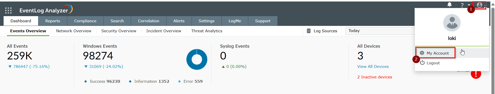 If the technician can login to the EventLog Analyzer and wants to update the password, they can follow the below steps