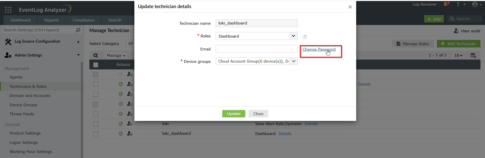 EventLog Analyzer UI -> Settings -> Admin Settings -> Technician & Roles