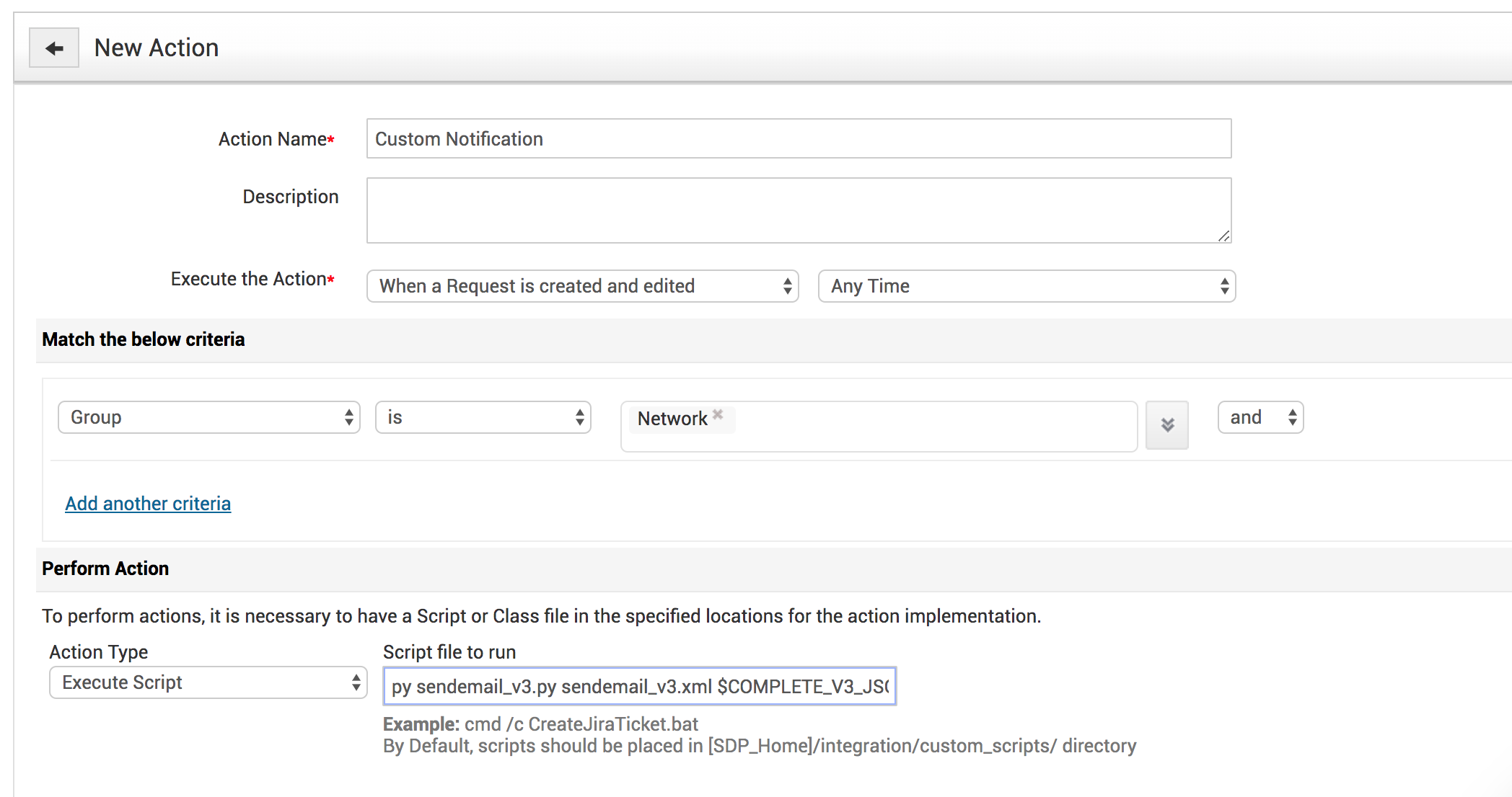 1.Copy the script and the configuration file into the custom script folder in the \Manageengine\ServiceDesk\integration directory.