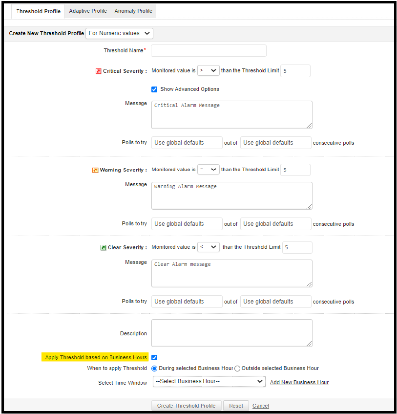Thresholds can be configured for customized business hour restrictions while creating the threshold profile by following the below steps: