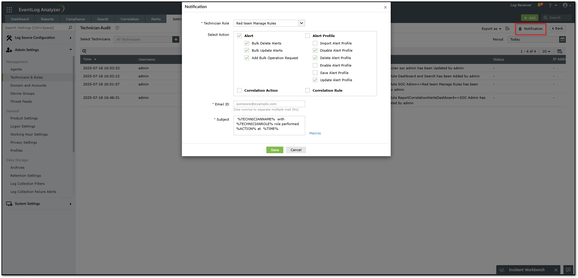 Monitor critical activities like agent management, alert modification by Technicians by configuring notification for the selective.