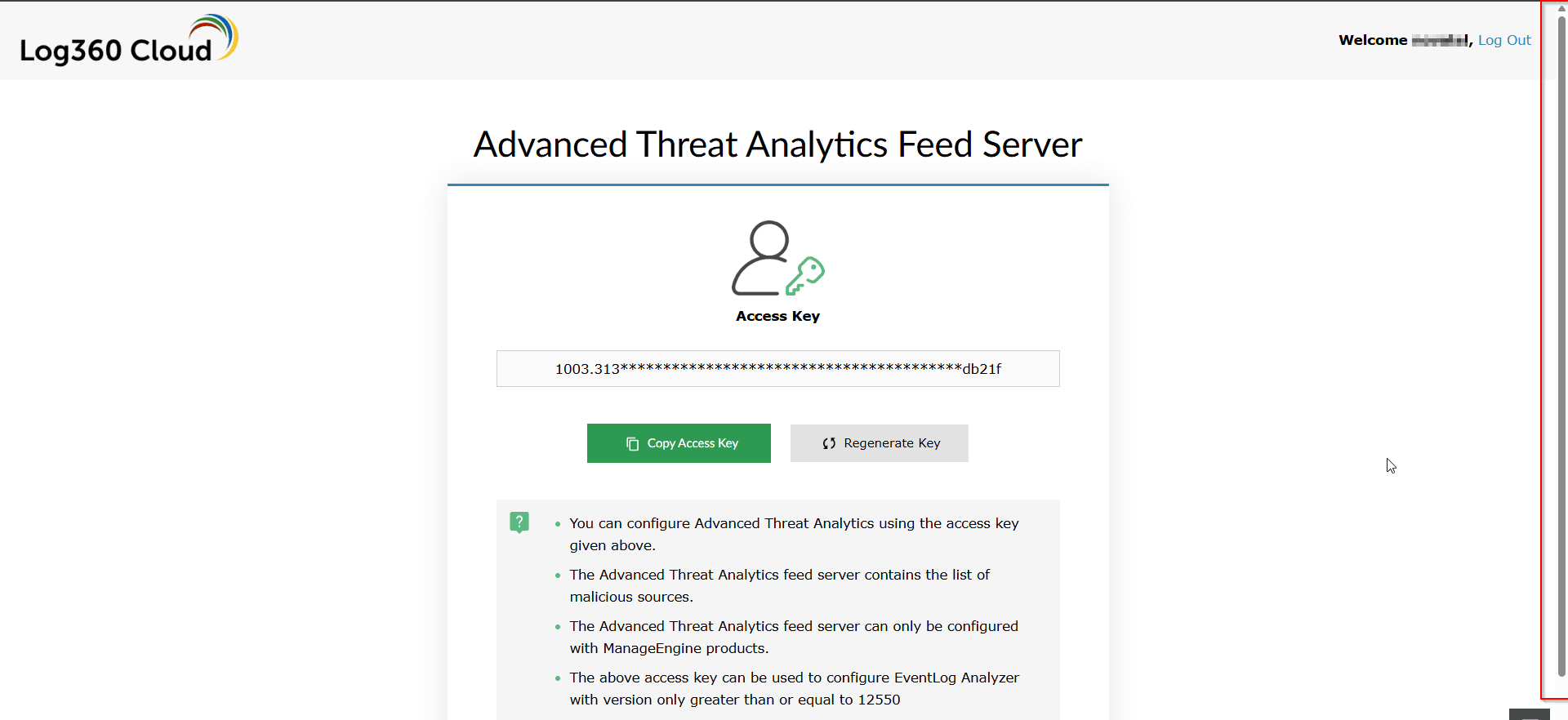 Ensure the access key is generated using the licensed email account on the Log360 Cloud Threat Feed server.