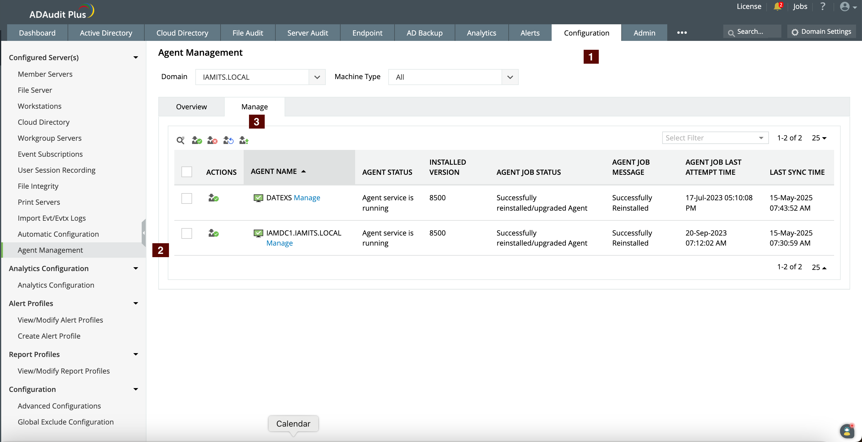 Navigate to Configuration > Configured Server(s) > Agent Management > Manage.