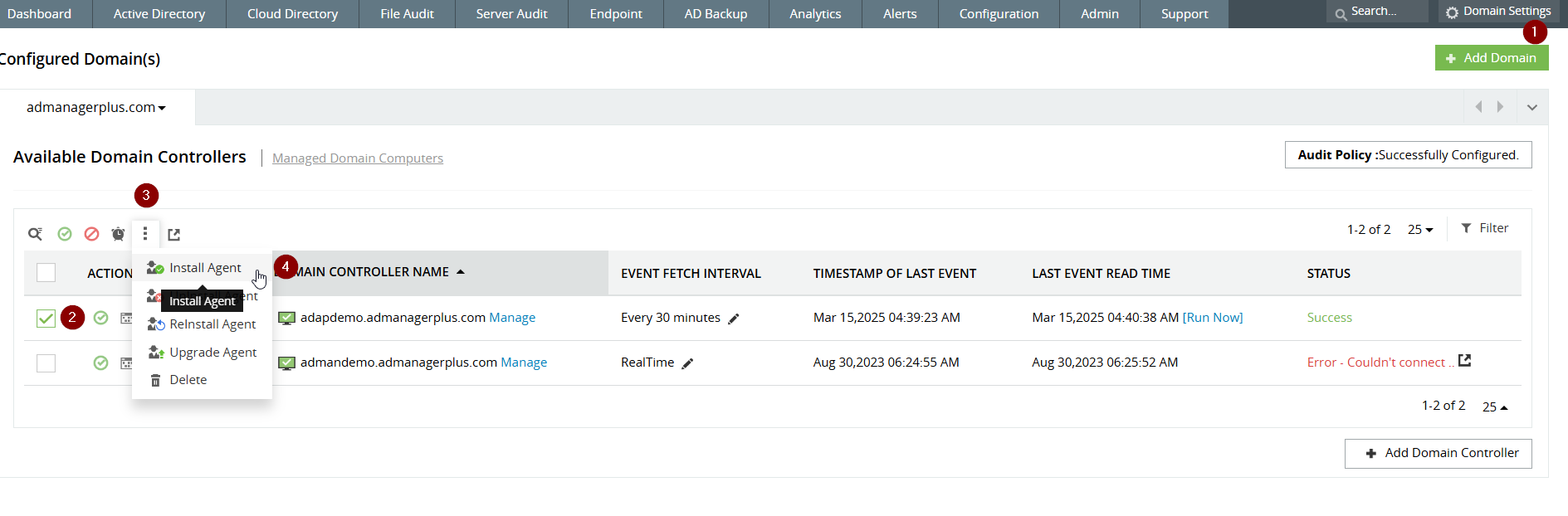 Navigate to Domain Settings located at the top right of the ADAudit Plus console.