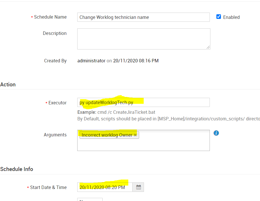 Schedule - Choose a time frame for schedule to execute and change the worklog owner.