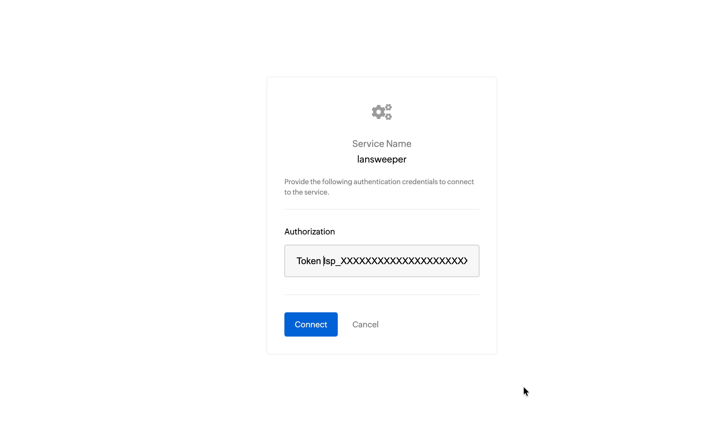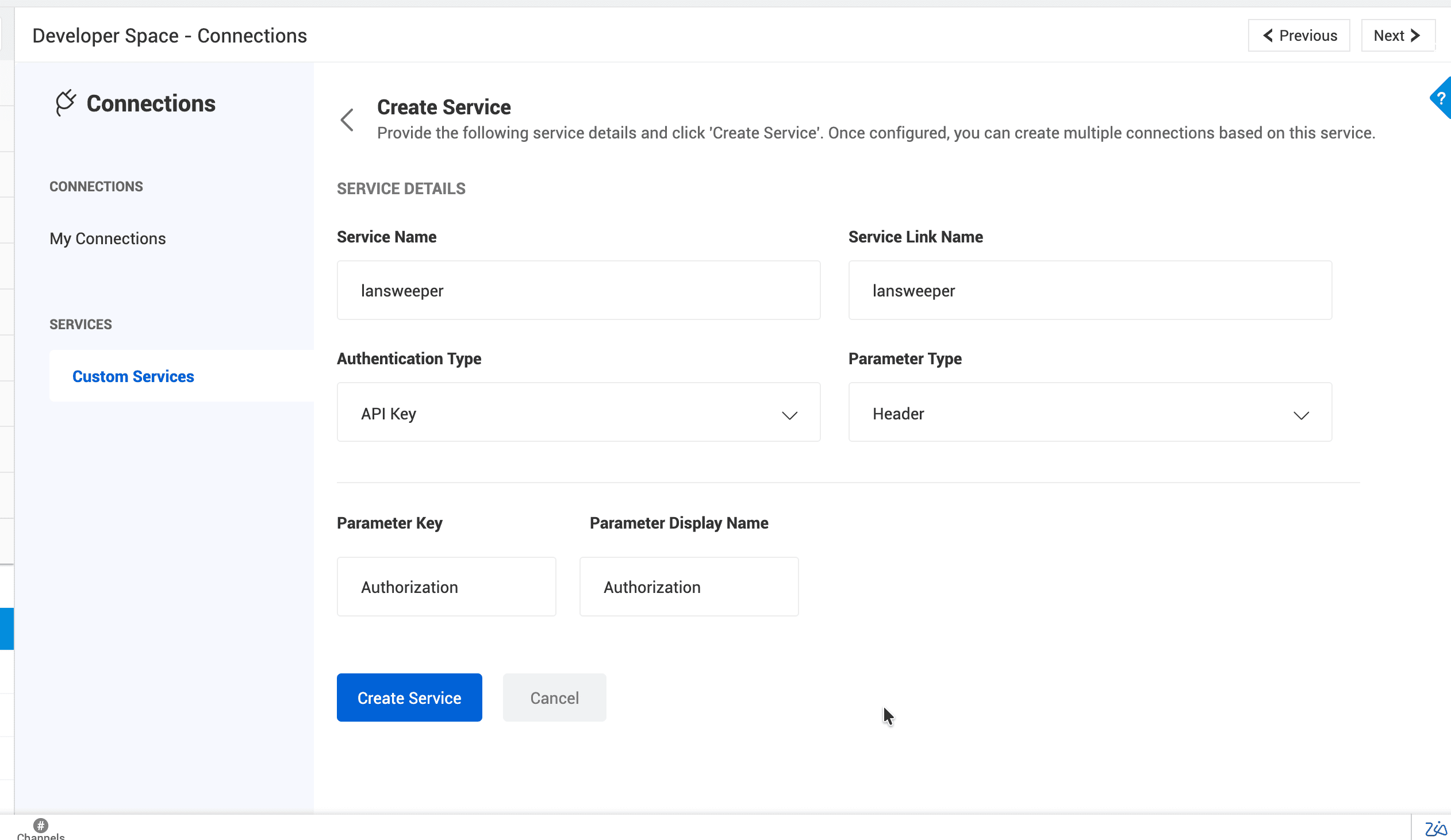 Create a service with name "lansweeper". Parameter Key, Parameter Type, and Authentication Type as shown below