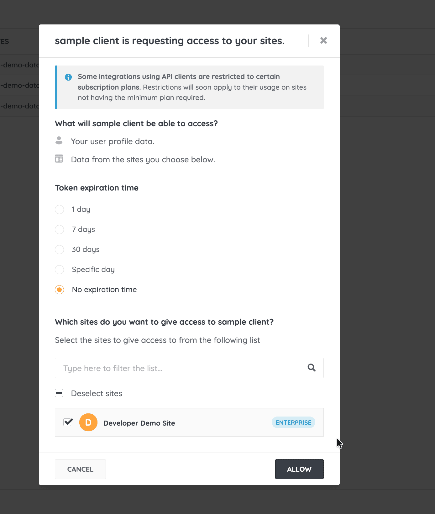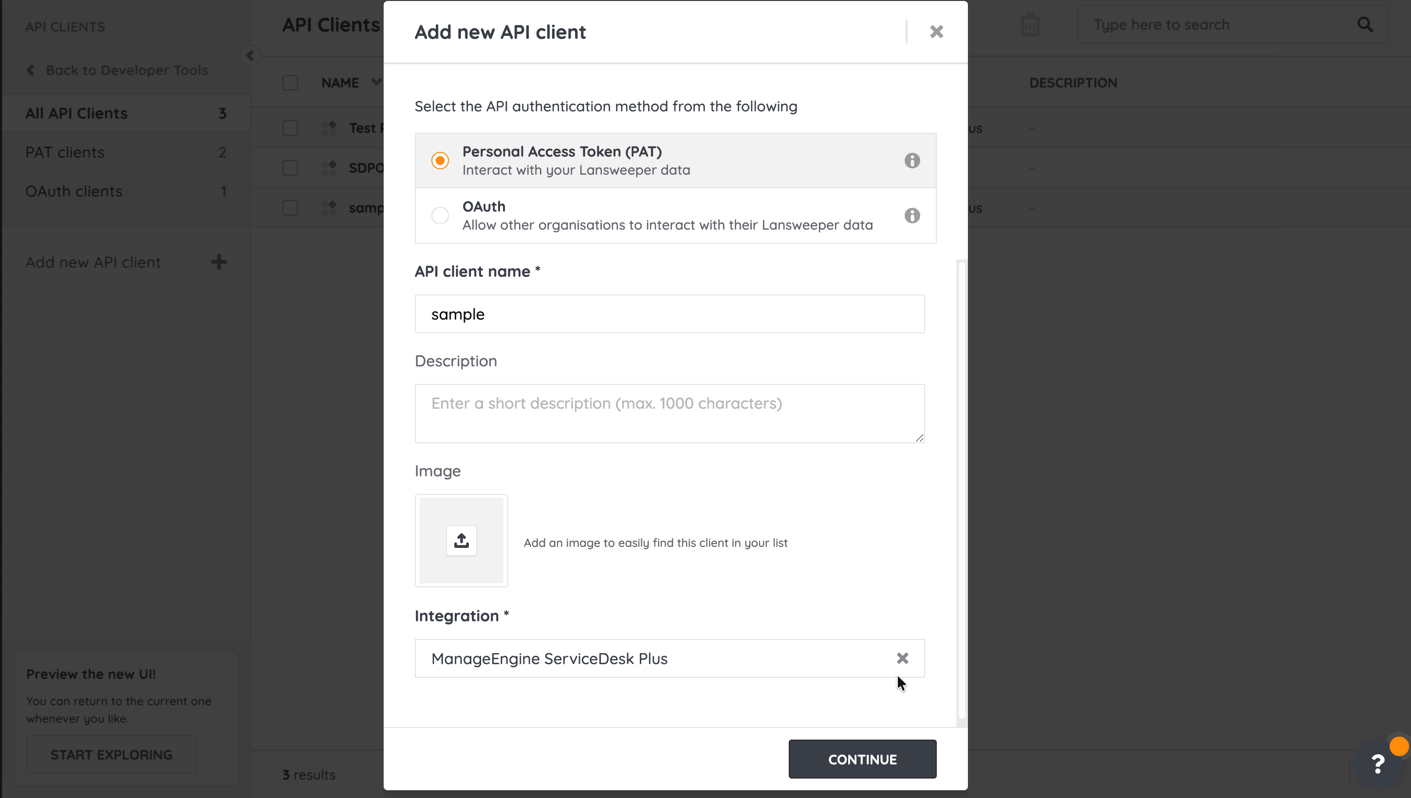 Create an API client in Lansweeper as described in the below screenshot. Click Continue.