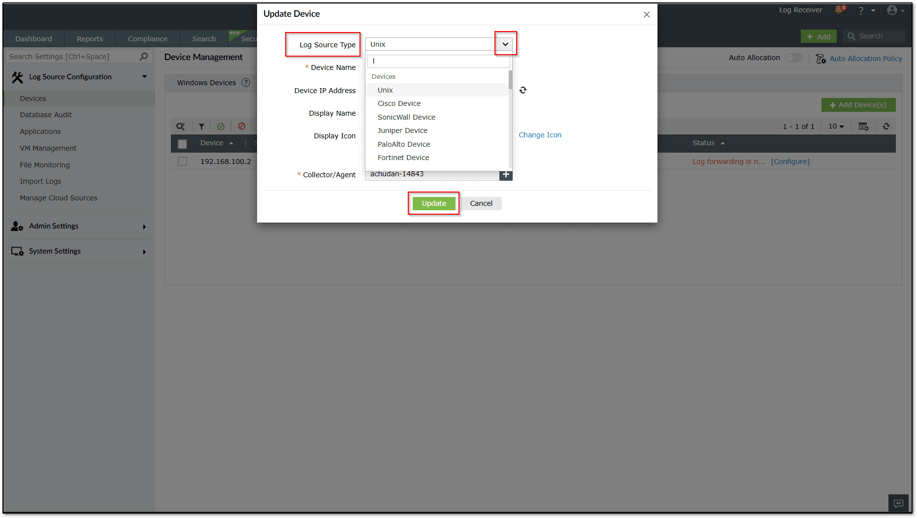 Add the device in EventLog Analyzer with same Device name that you have noted in the above step.