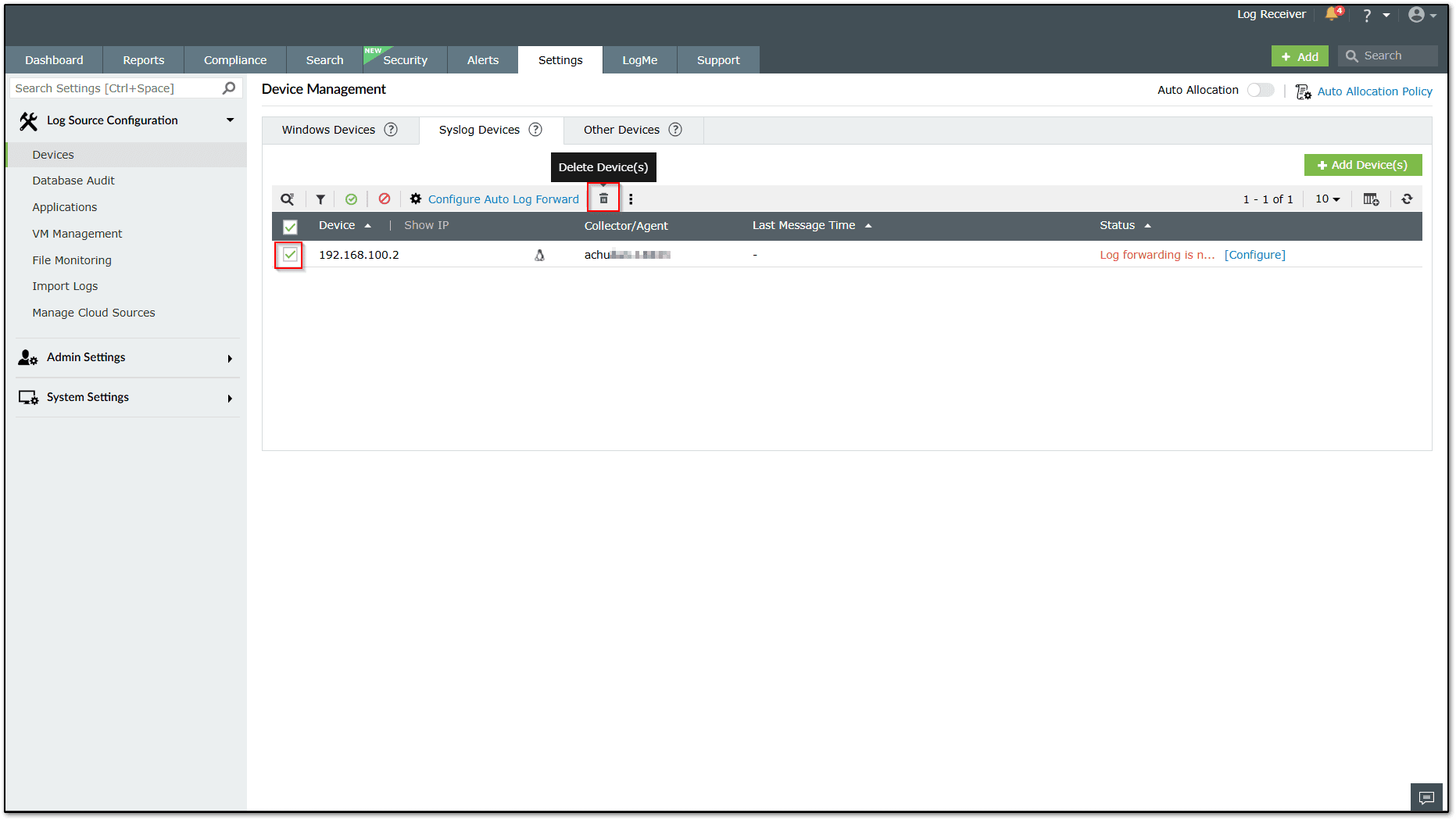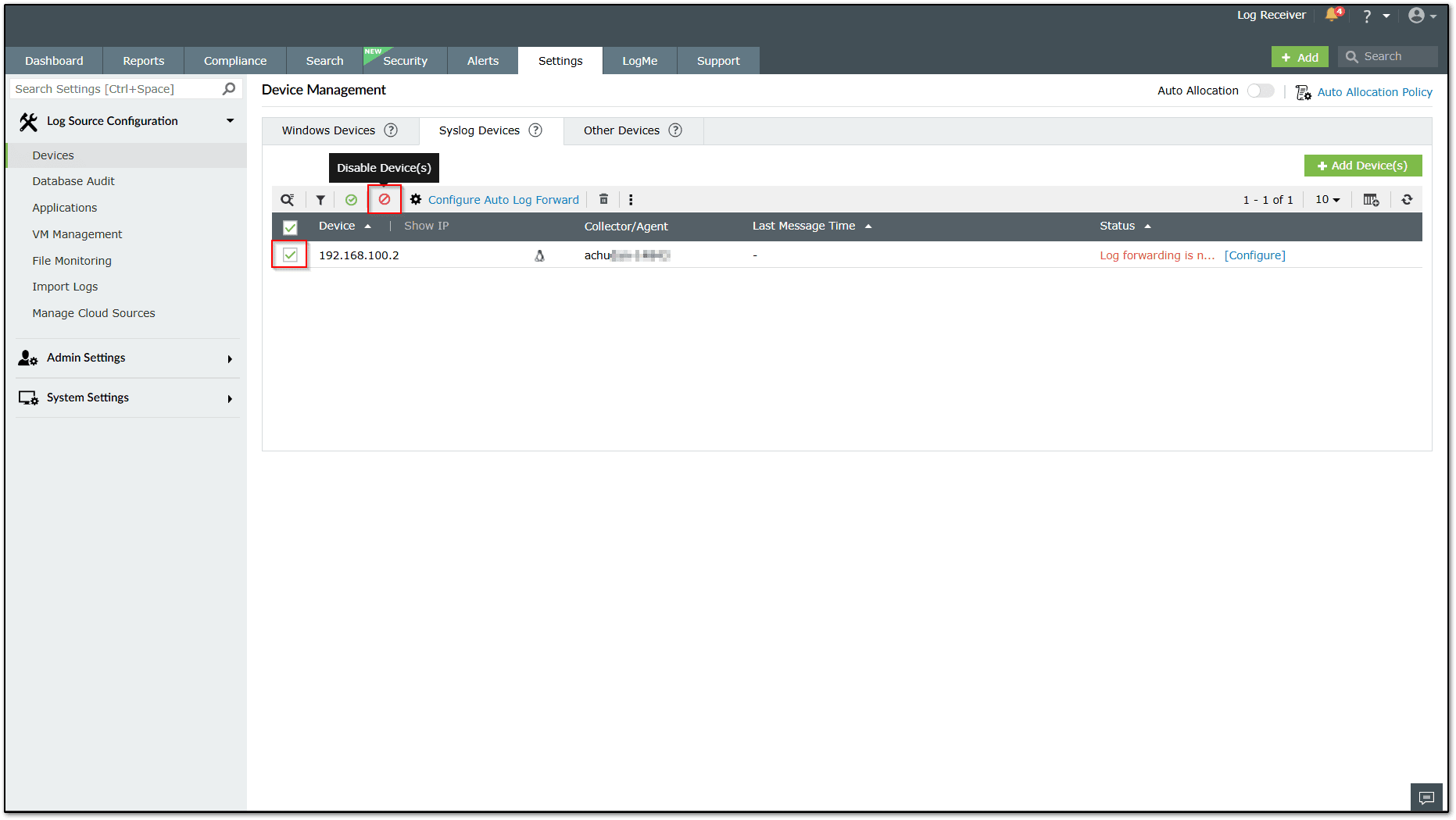 NOTE: Disabling the device will free up the license and retain all the configurations. You can load the data from Raw live logs, archives etc.