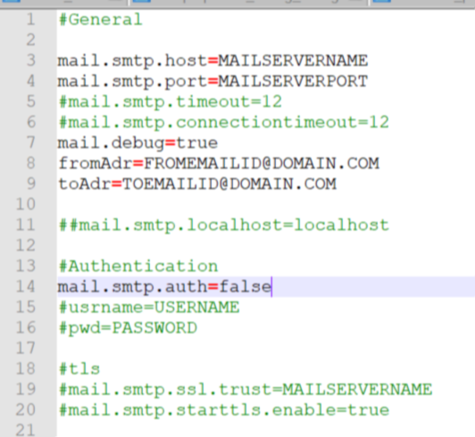 2.1. Update the mail Servername/IP (mail.smtp.host) , port (mail.smtp.port) , from Email ID (fromAddress), to Email ID (toAddress).