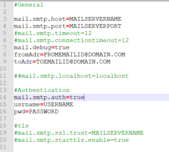 2.2. If Mail Server requires authentication, give mail.smtp.auth=true, and update User Name (usrname) and Password (pwd).
