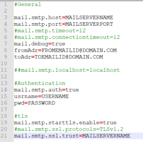 2.4. If TLS enabled, the lines under #tls should be uncommented and updated mail servername/IP(mail.smtp.ssl.trust) and mail.smtp.starttls.enable=true