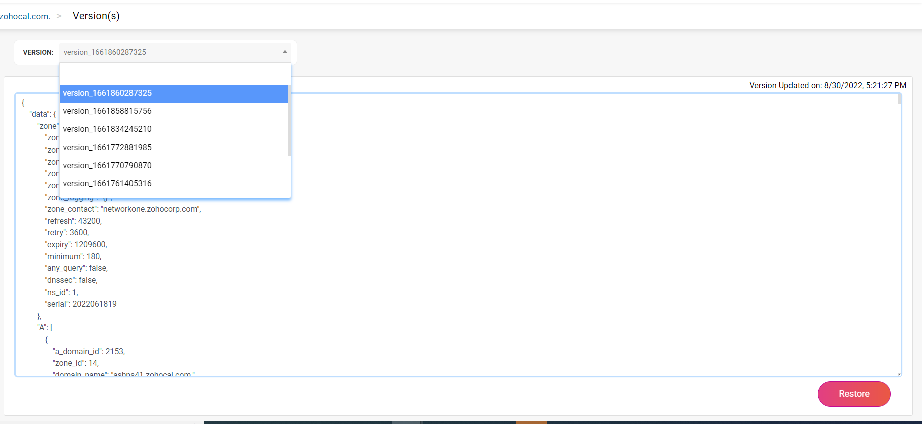 With both Primary GeoDNS and Primary AXFR type of domains CloudDNS enables you store around ten previous versions of your mission- critical zone files. You can rollback to your previous configurations anytime by selecting and restoring the previous version of your choice.Each time you make a change in your zone files, whether small or big, ManageEngine CloudDNS counts it as a version of your zone.