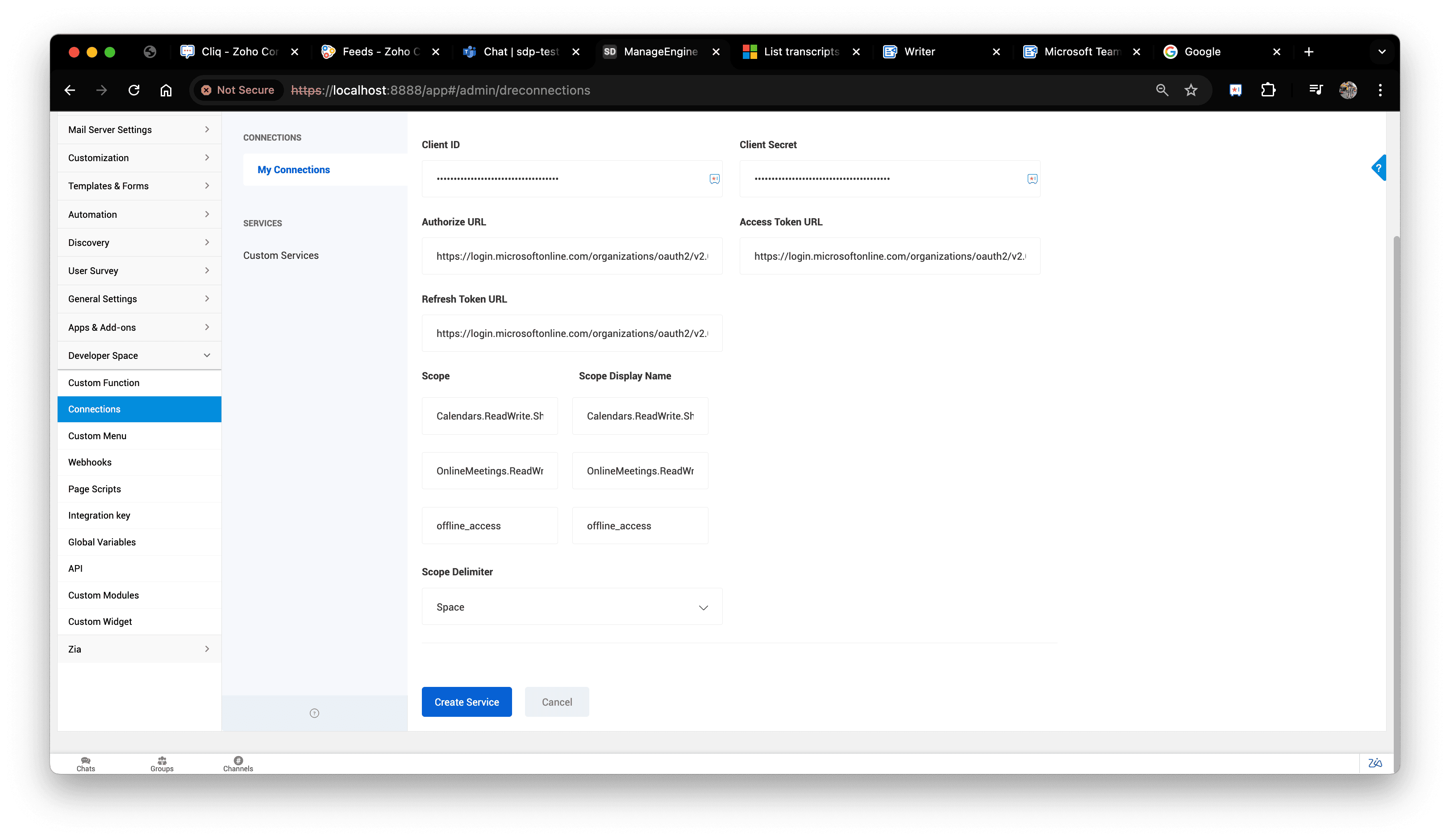 Once done, click on Create Service, post which you'll be asked to authorise the connection. Name the connection as microsoftteams, select all the three scope checkboxes and click on Create And Connect.