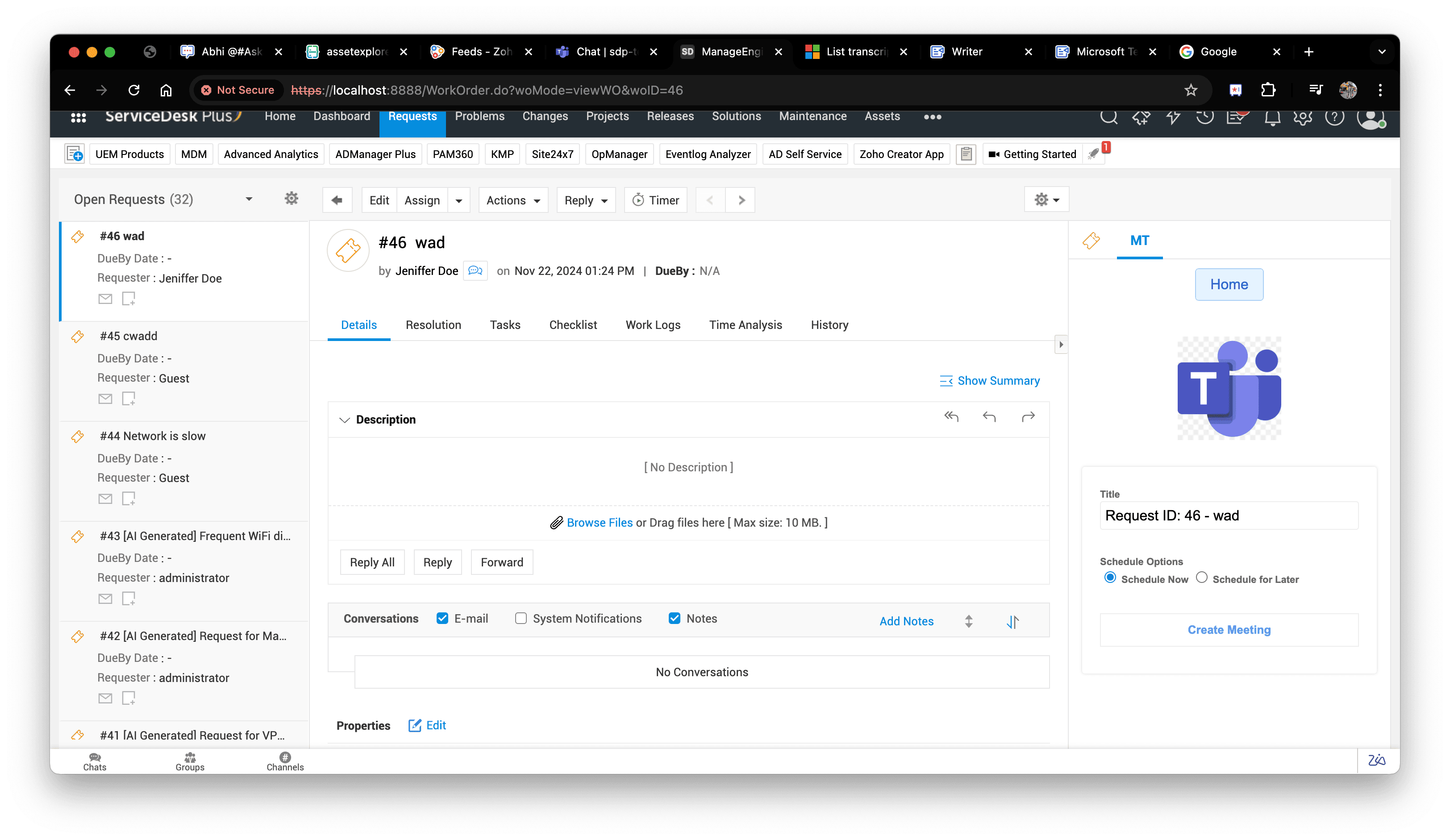 The Microsoft Teams widget enables technicians to create and schedule meetings directly from within ServiceDesk Plus.