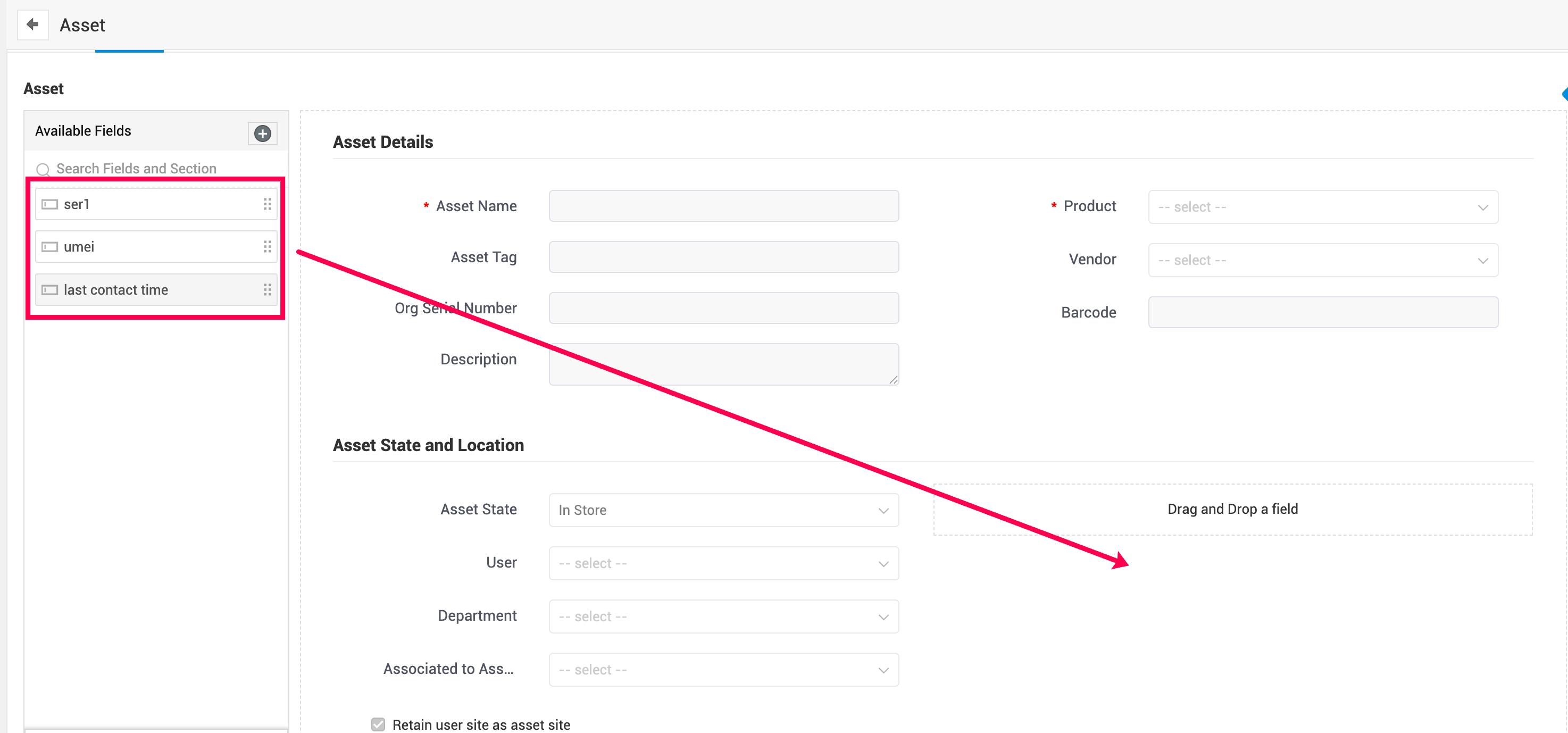 Note: for versions above 15100/7700 , please make sure to include them by drag and drop these additional field under Asset product type fields (Admin -> Asset Management -> Product Type)