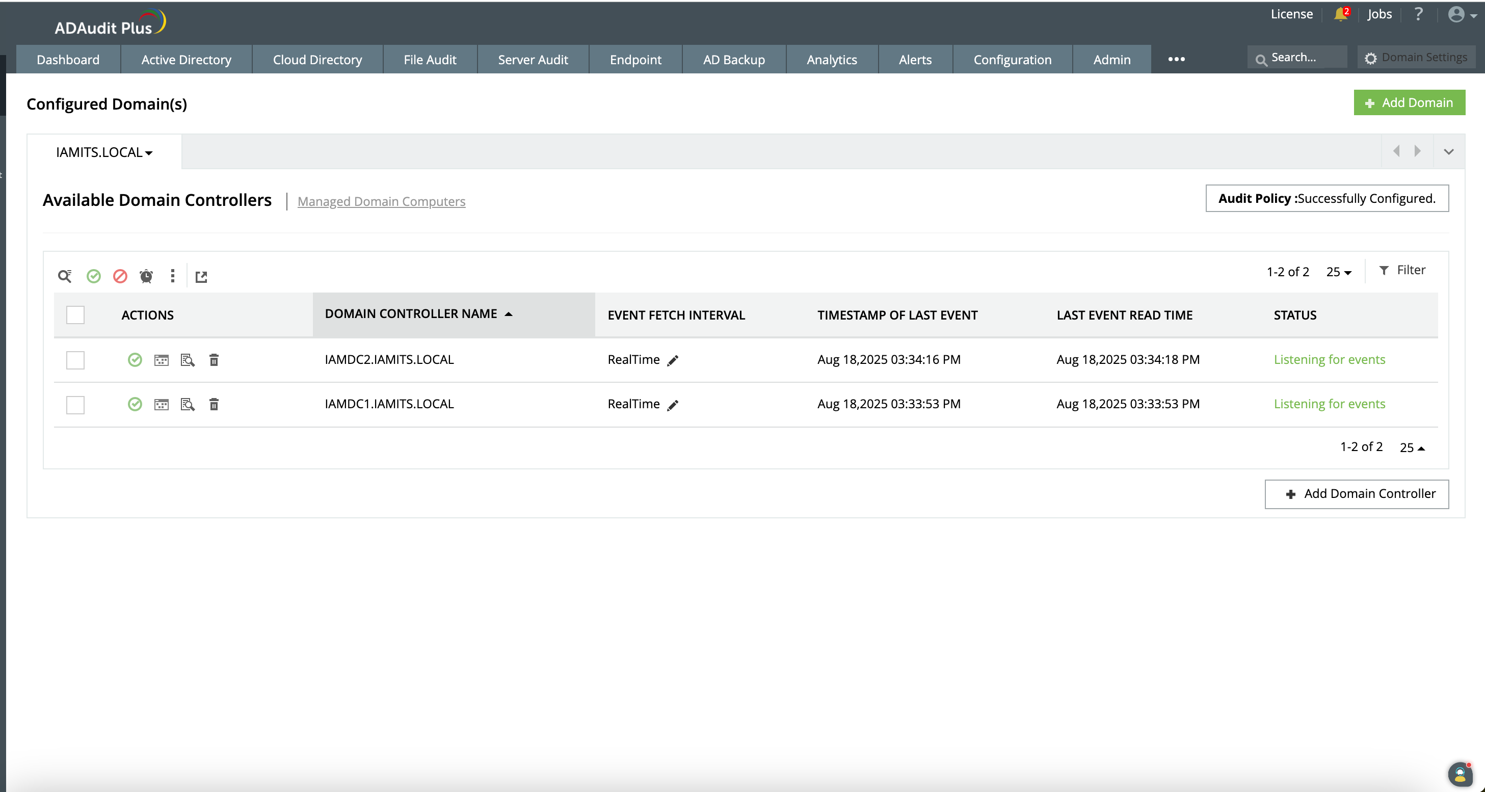 First, ensure that all domain controllers are properly configured within ADAudit Plus.