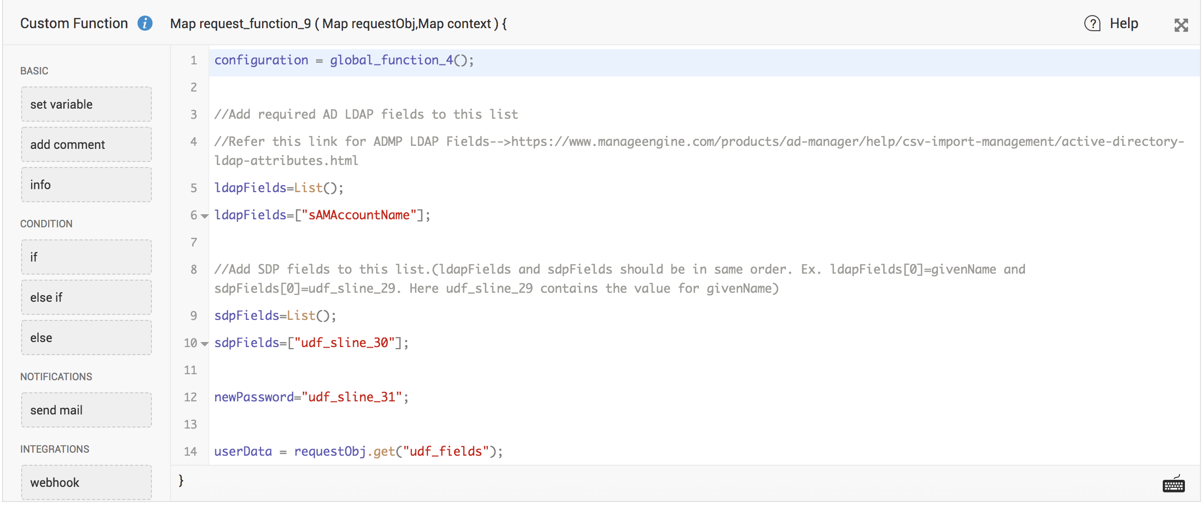 Eg: sAMAccountName is stored in udf_sline_30 and newPassword is stored in udf_sline_31