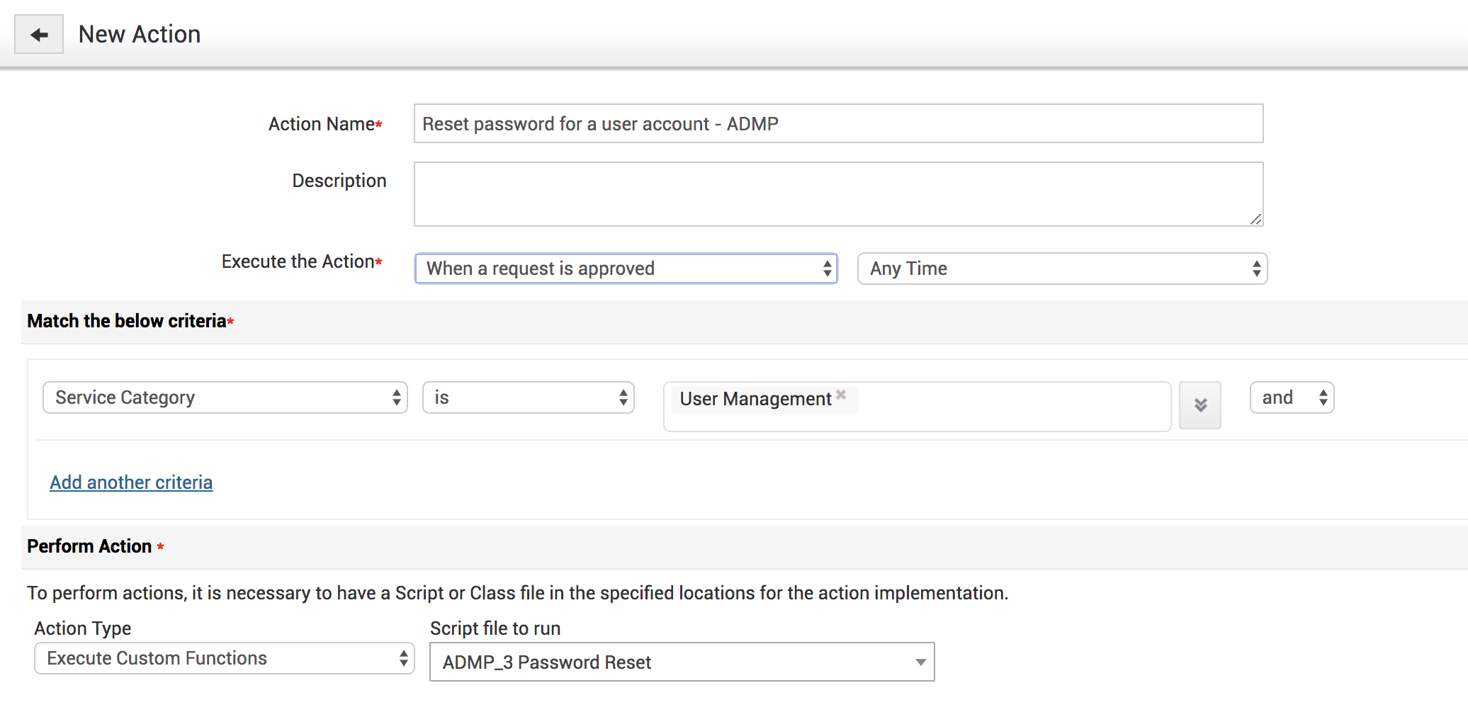 5. With custom triggers we can configure a criteria such as ‘when a request is created or approved’ to invoke the deluge script stored in the custom function and automatically resets the password for the user account in ADMP.