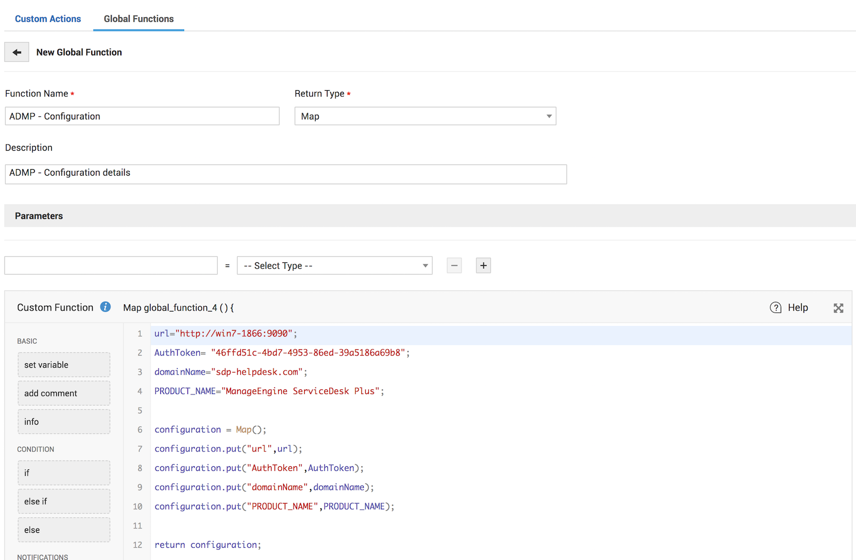 3. The functional part of the script has to be defined under Admin > Request custom function > Custom Action.