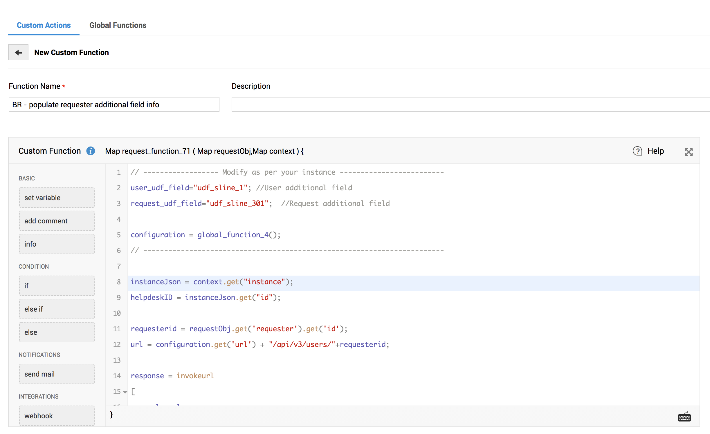 3. Goto Admin > Request Custom Function > Custom Function > New > Paste the "BR_Update UserAdditionalInfo_in_RequestAdditionalField.txt" content and save it with a name