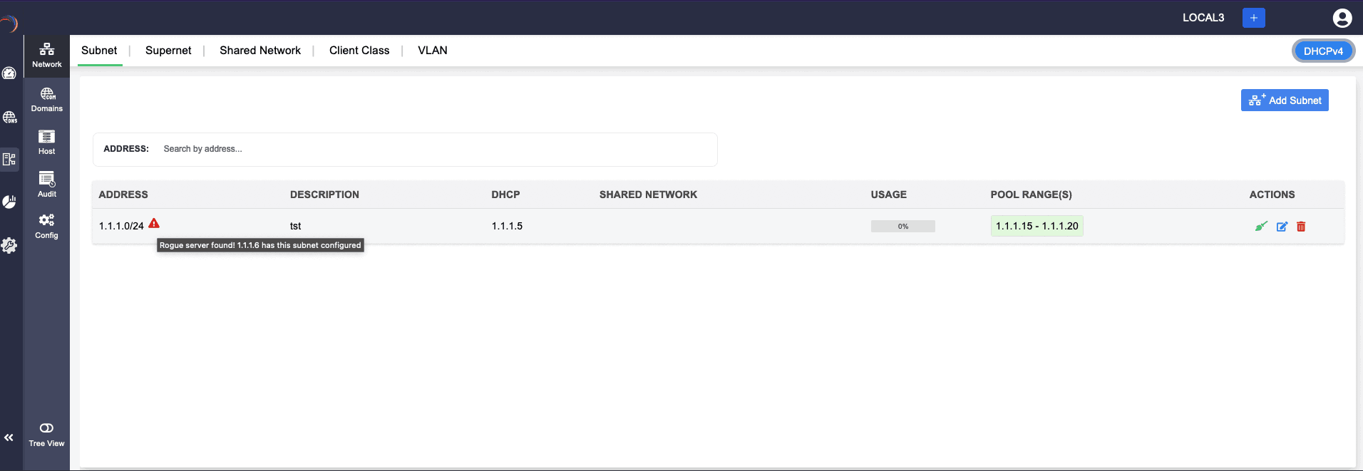 DDI Central identifies and promptly alerts about rogue servers that are assigning IP addresses to a subnet. This kind of attack involves a rogue DHCP server issuing lease requests to clients with invalid or inappropriate IP addresses and/or option parameters. Such "man in the middle" attacks might aim to improperly configure client devices by altering default gateway settings or DNS server addresses. Conducting regular IP address sweeps or discoveries is an effective way to detect rogue devices, including unauthorized DHCP servers.