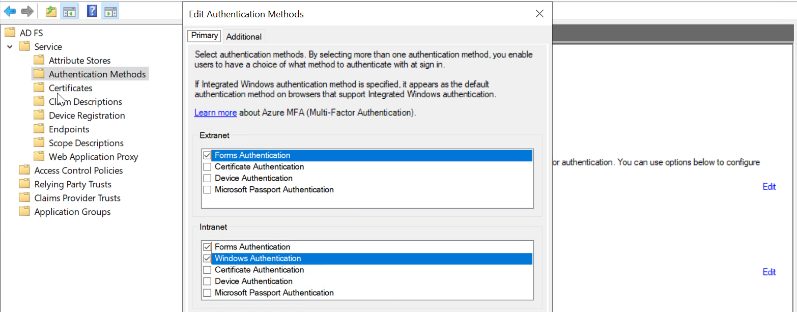 Step 1: In the AD FS server, under Authentication Methods, make sure that Windows Authentication is selected.