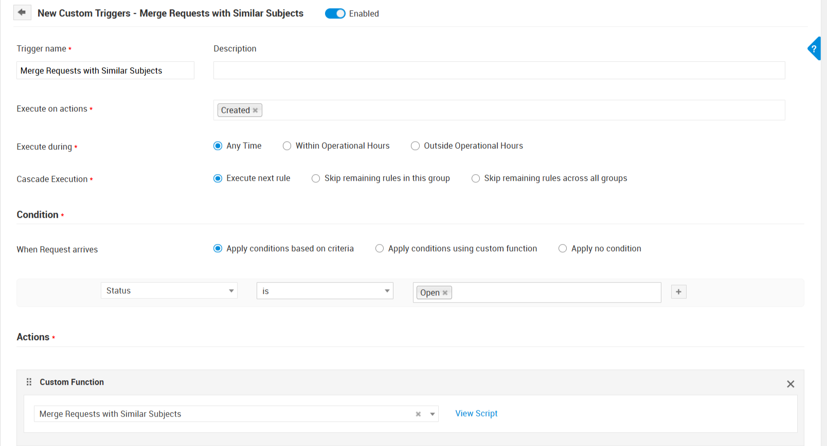 Under Actions, select Execute Custom Function → Merge Requests with Similar Subjects.