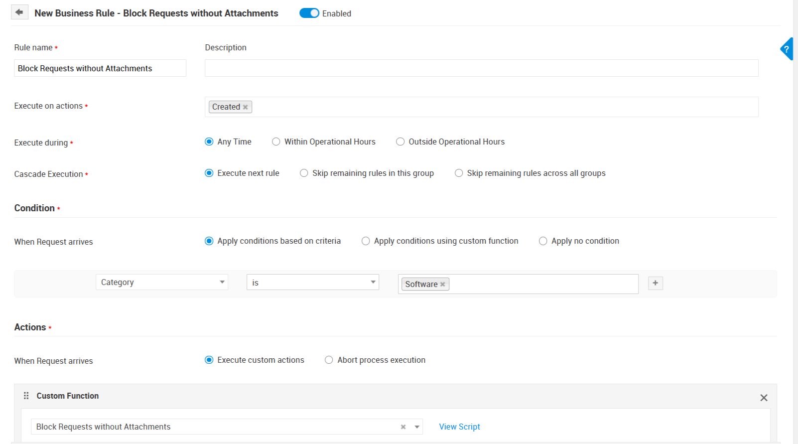 Under Actions, select Execute Custom Function → Block Requests without Attachments.