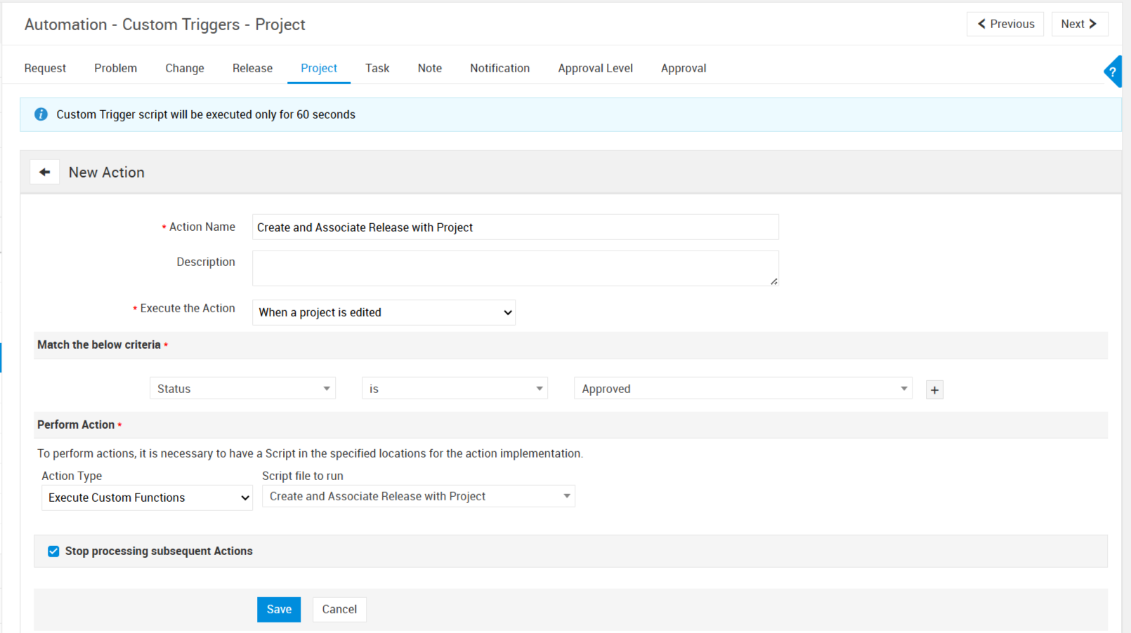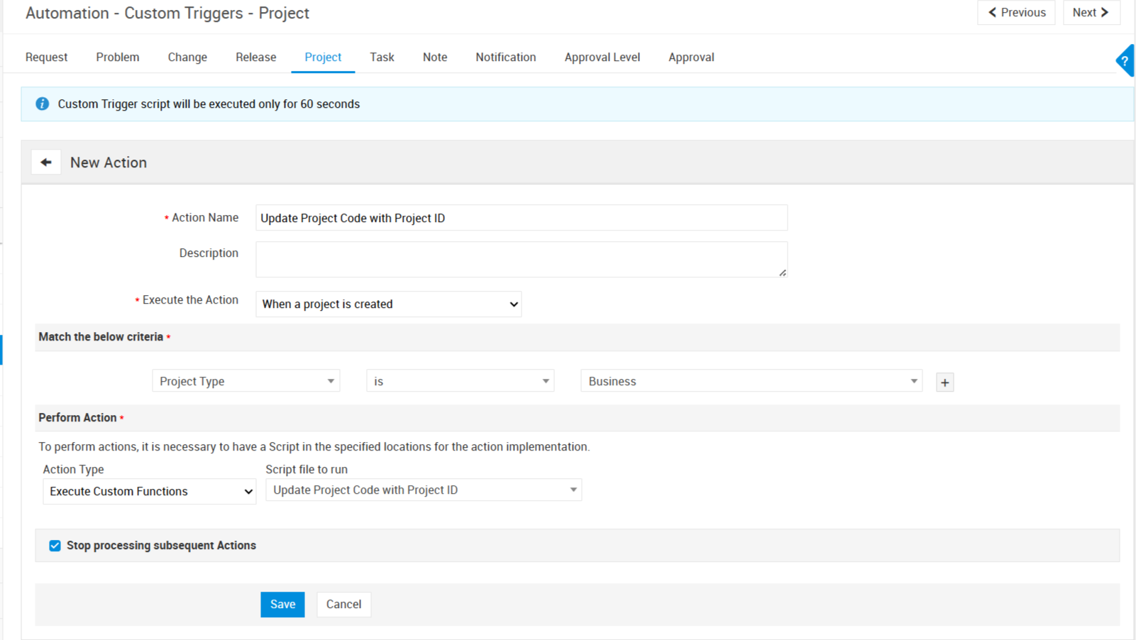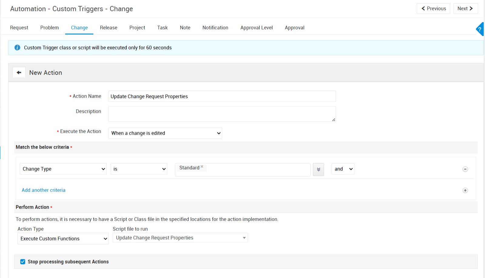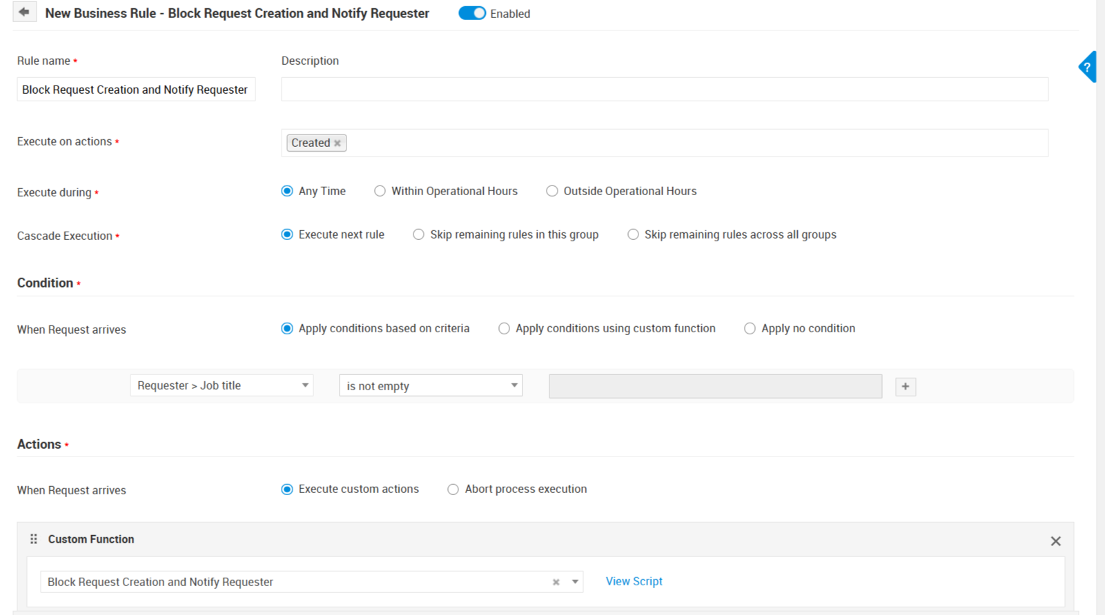 Under Actions, select Execute Custom Function → Block Request Creation and Notify Requester.
