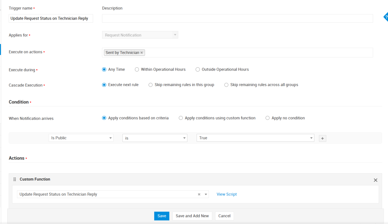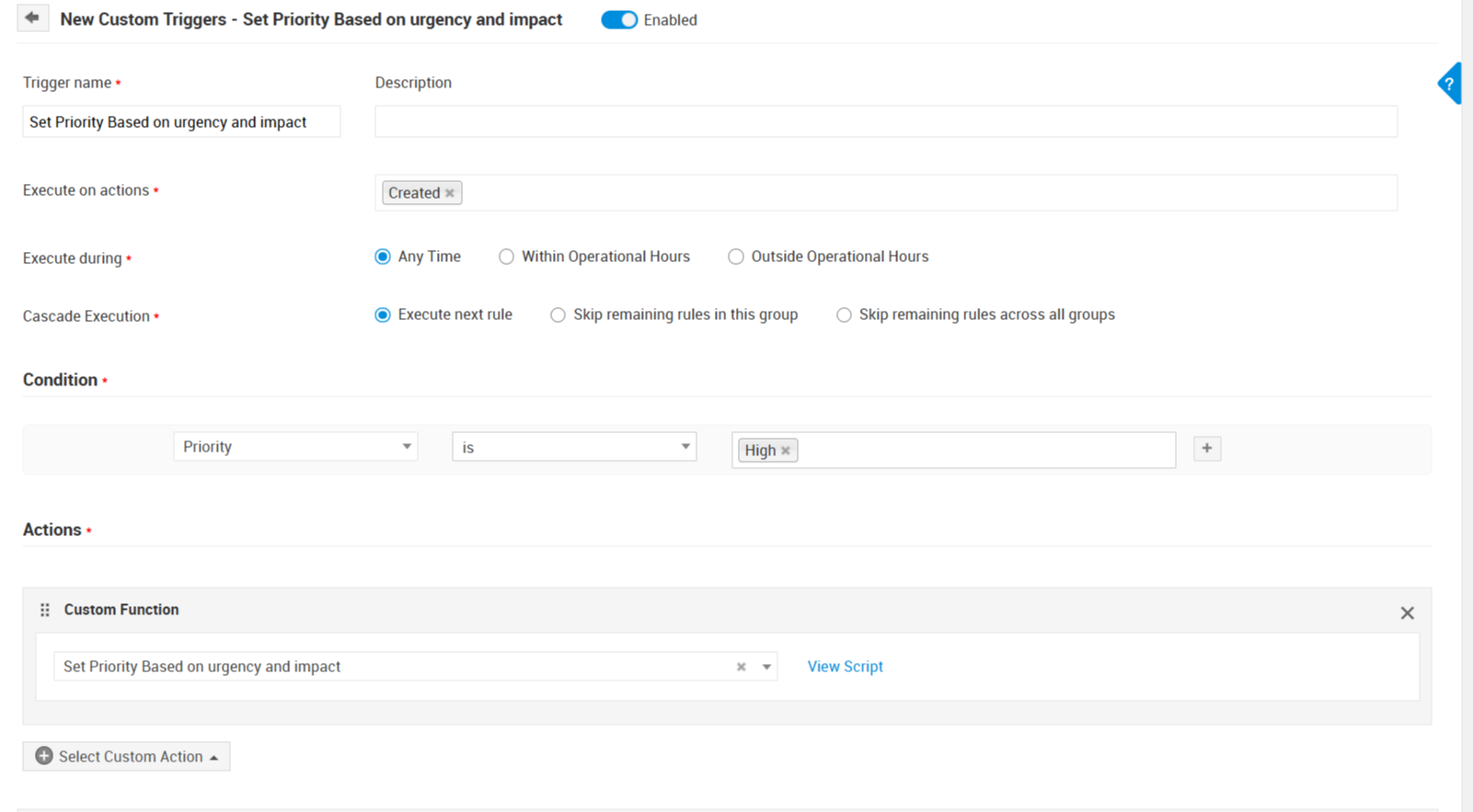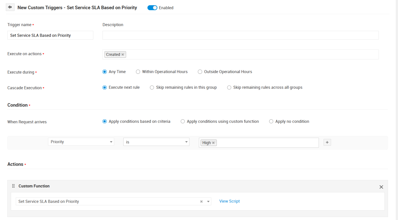 Under Actions, select Execute Custom Function → Set Service SLA Based on Priority.