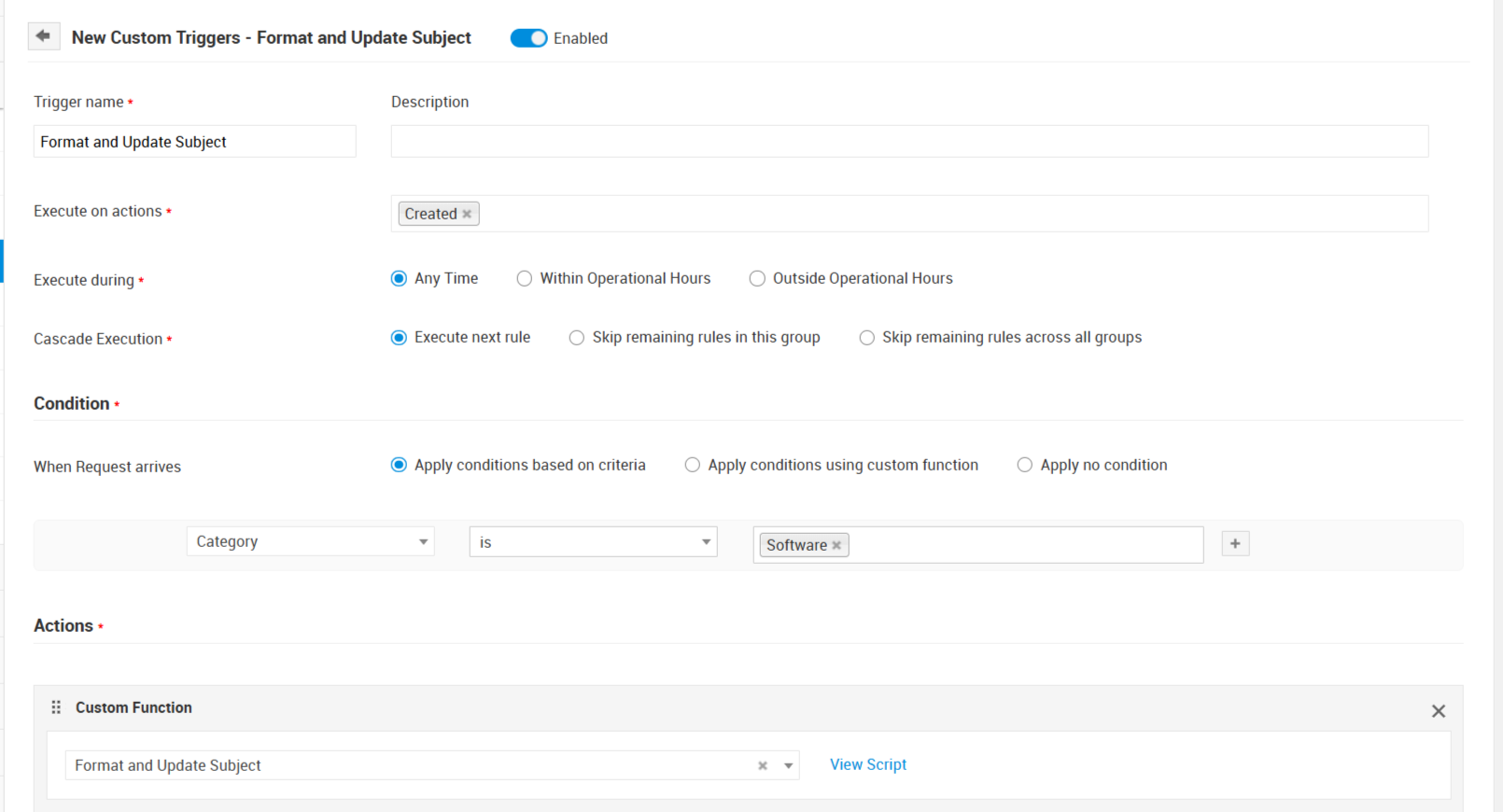 Under Actions, select Execute Custom Function → Format and Update Subject.