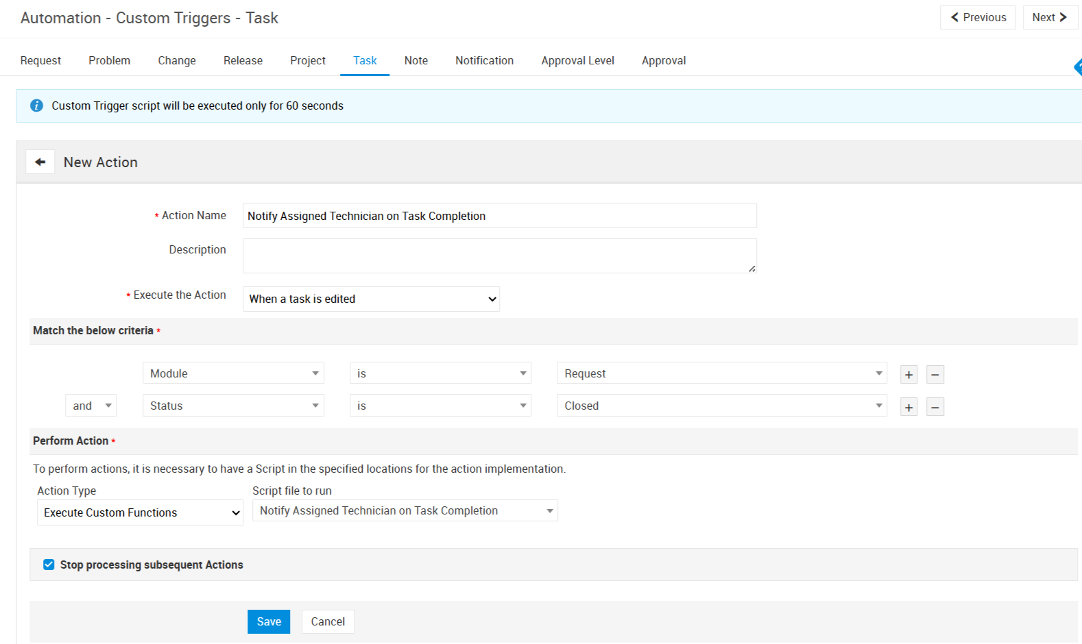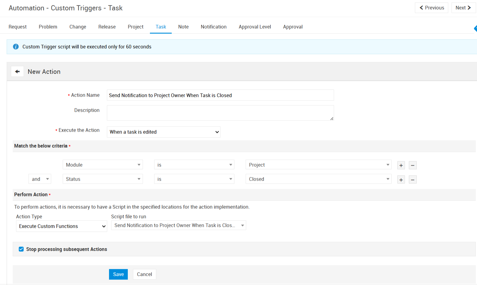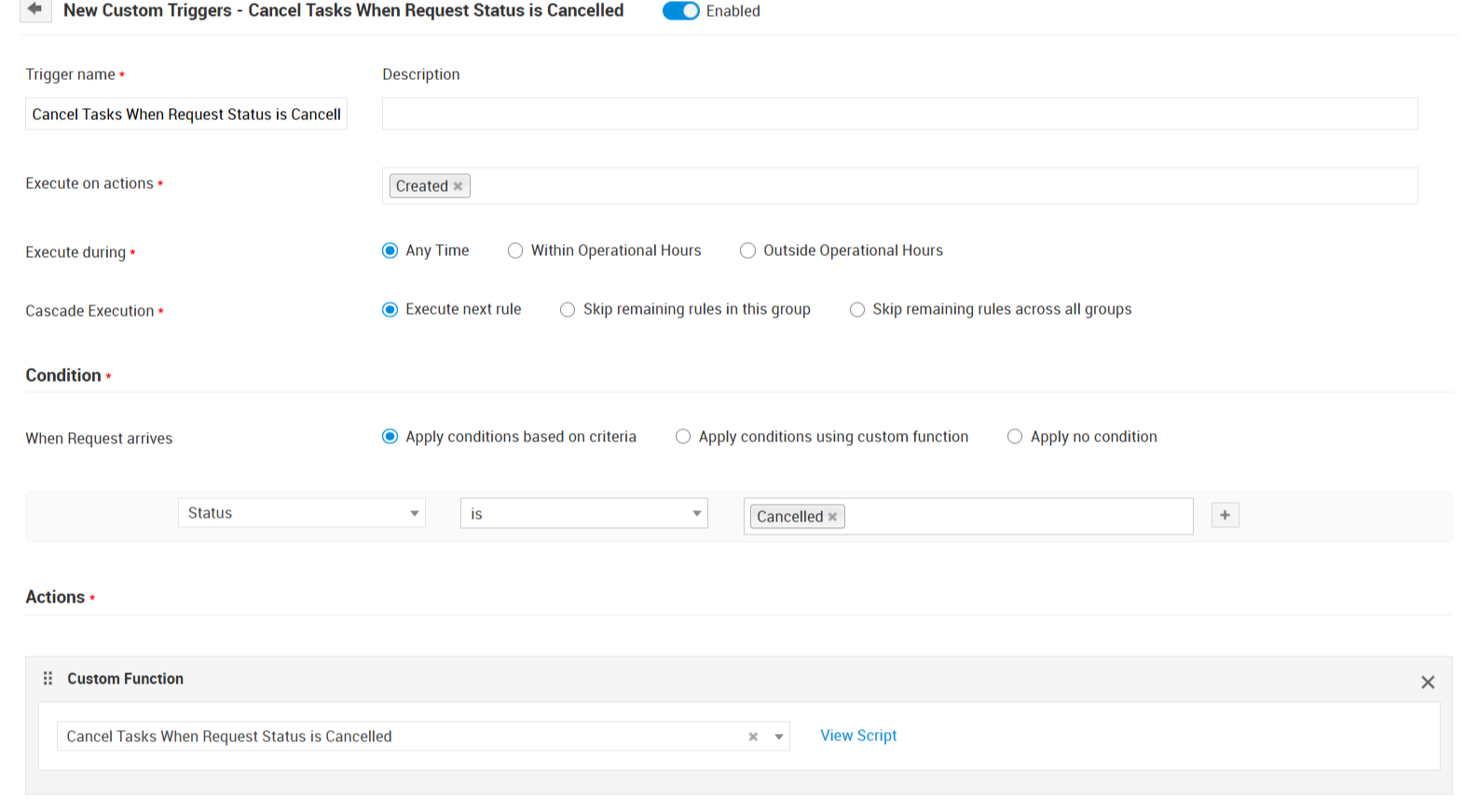 Under Actions, select Execute Custom Function → Cancel Tasks When Request Status is Cancelled
