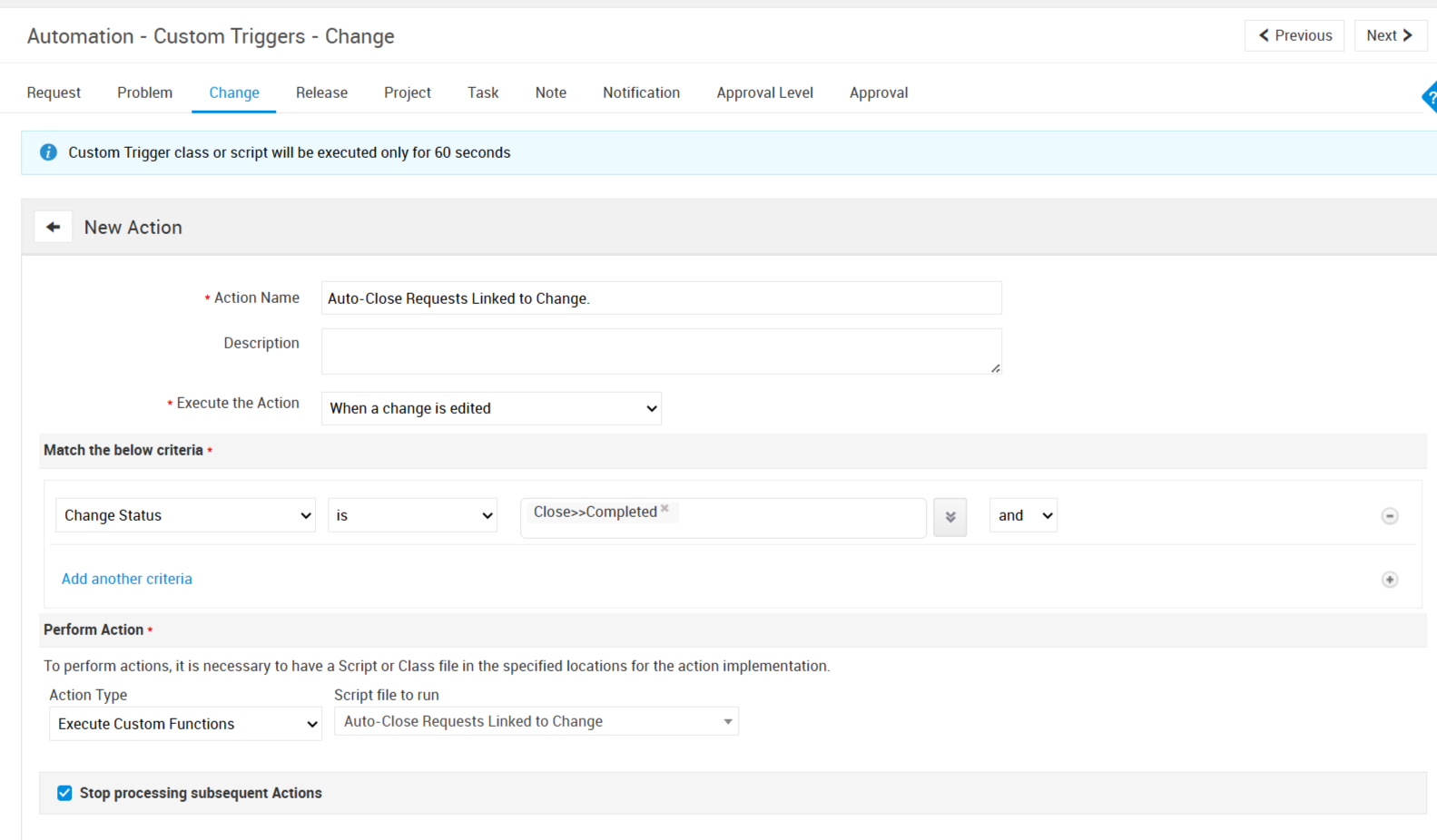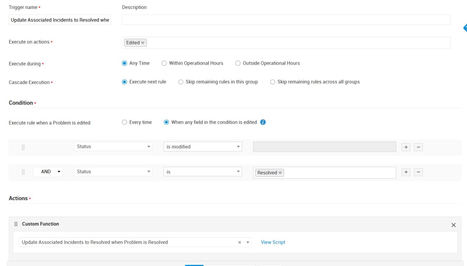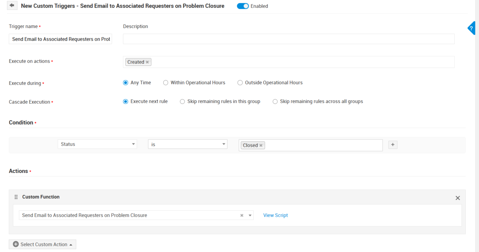 Under Actions, choose Execute Custom Function → Auto-Resolve and Close Request.