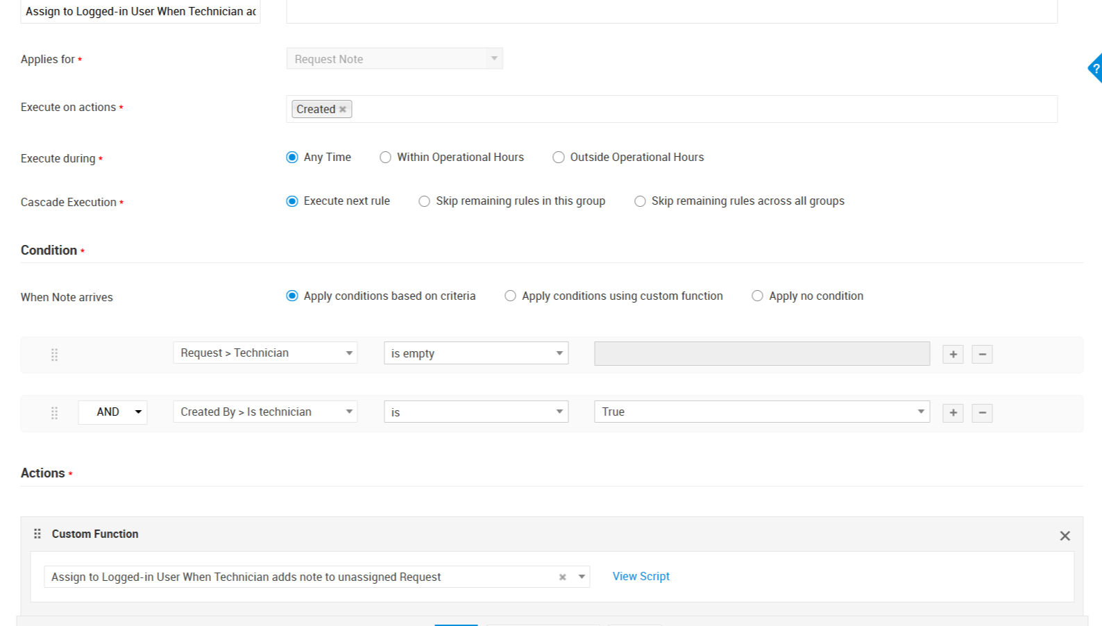 Under Actions, select Execute Custom Function → Assign to Logged-in User When Technician Adds Note to Unassigned Request.