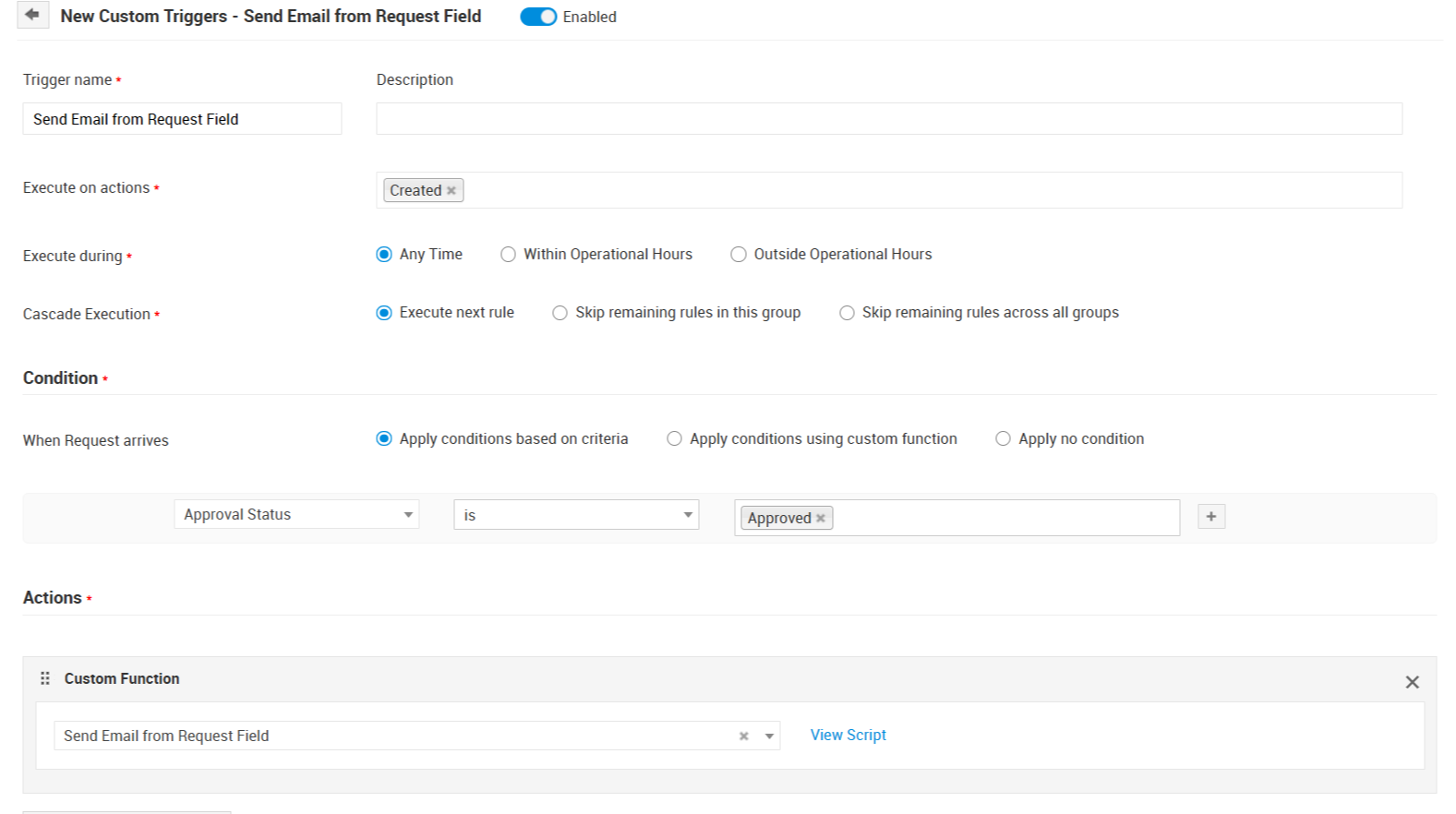 Under Actions, select Execute Custom Function → Send Email from Request Field.