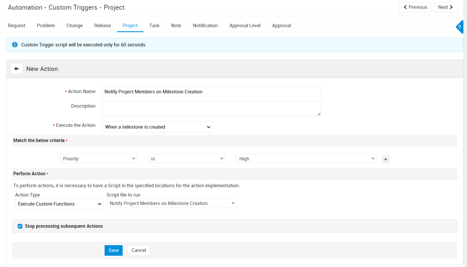 Under Actions, select Execute Custom Function → Notify Project Members on Milestone Creation.
