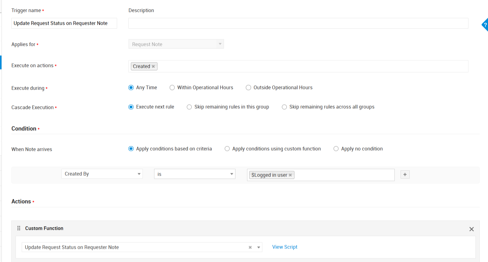 Under Actions, select Execute Custom Function → Update Request Status on Requester Note.