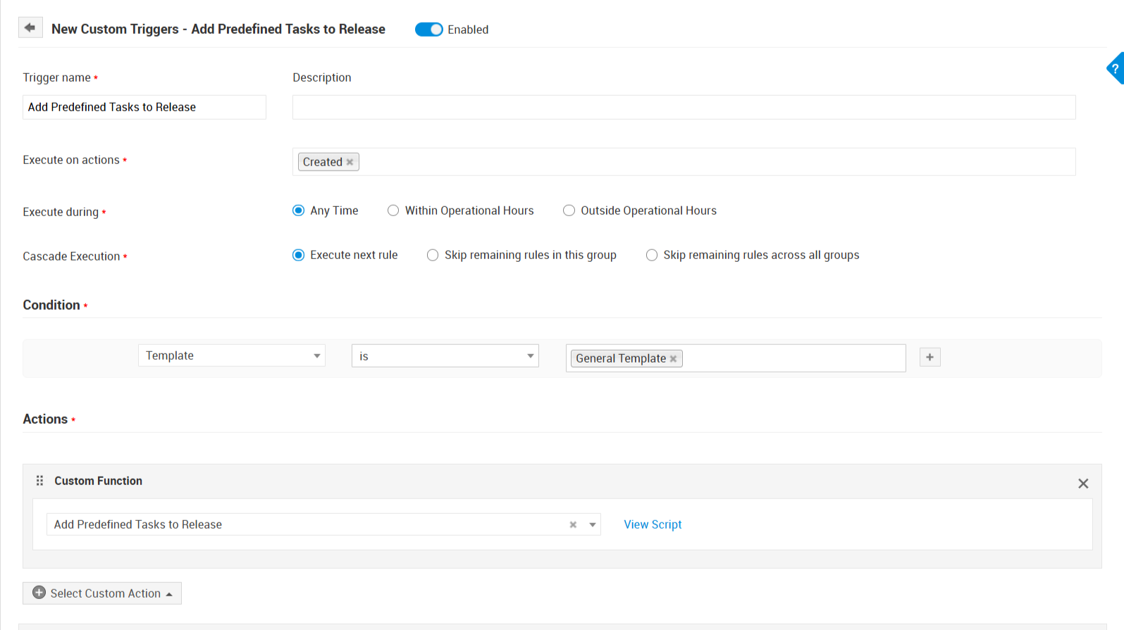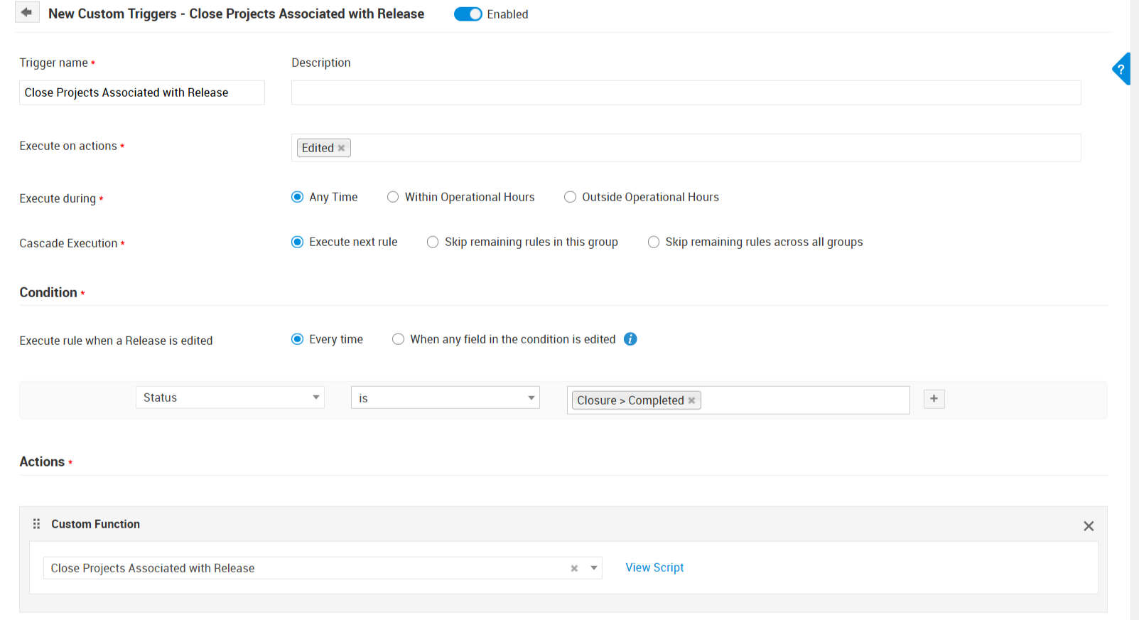 Under Actions, select Execute Custom Function → Create and Associate Release with Project.