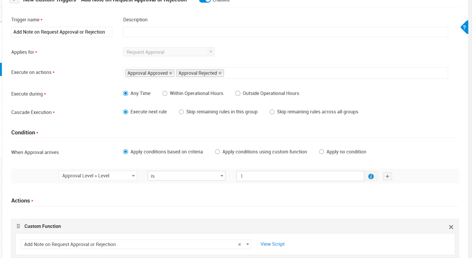 Under Actions, select Execute Custom Function → Add Note on Request Approval or Rejection.