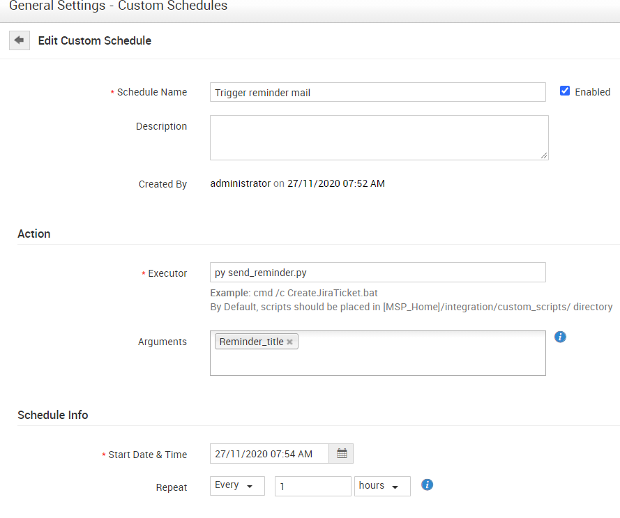 5. Go to Admin > Custom Schedule > give a schedule name > execute script > py send_reminder.py