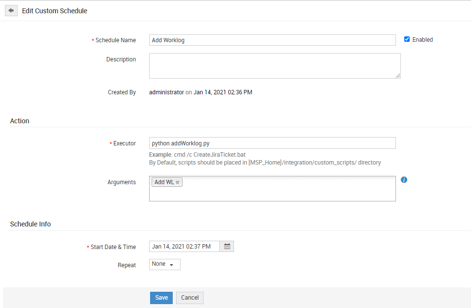 Create a new custom schedule with a unique Schedule Name. Mention the command to execute the script in the Executor field. Associate the required Query Reports as Arguments. Mention the Start Date & Time when the action should take place. Schedule the action by specifying the Repeat interval. Enable/Disable a custom schedule as preferred.