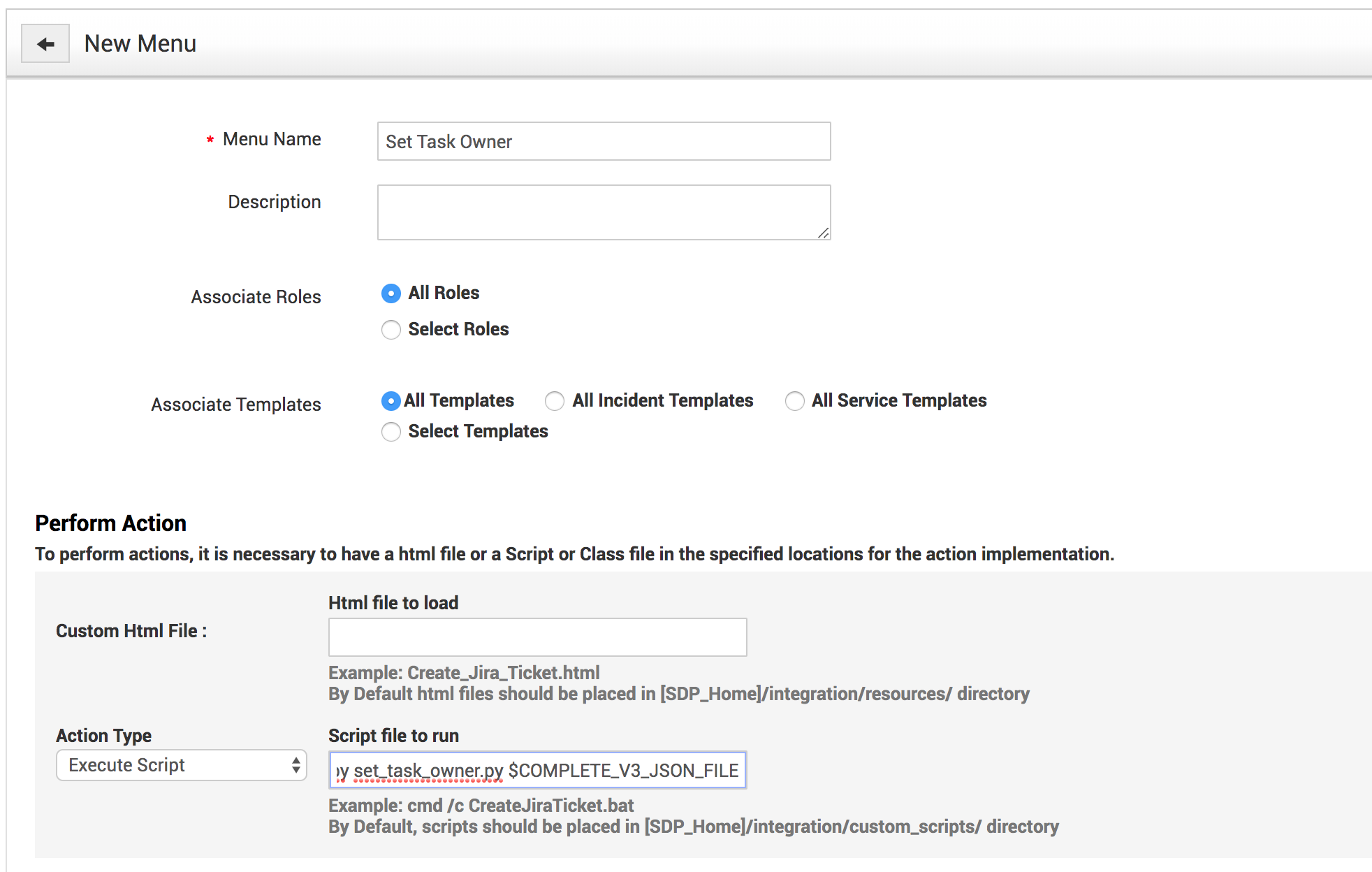5. For Request Custom Menu: Go to Admin > Request Custom Menu > give a menu name > Action Type : execute script > py set_task_owner.py $COMPLETE_V3_JSON_FILE. Invoke this script from Request Details page > Actions > Menu Name.