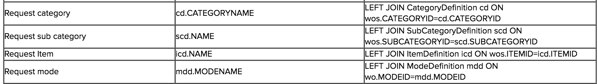 SELECT wo.WORKORDERID AS "Request ID", wo.TITLE AS "Subject", cd.CATEGORYNAME AS "Category", std.STATUSNAME AS "Request Status", mdd.MODENAME "Request Mode" FROM WorkOrder wo LEFT JOIN WorkOrderStates wos ON wo.WORKORDERID=wos.WORKORDERID LEFT JOIN CategoryDefinition cd ON wos.CATEGORYID=cd.CATEGORYID LEFT JOIN StatusDefinition std ON wos.STATUSID=std.STATUSID LEFT JOIN ModeDefinition mdd ON wo.MODEID=mdd.MODEID WHERE (wo.ISPARENT='1') AND wo.CREATEDTIME >= <from_thismonth> AND wo.CREATEDTIME <= <to_thismonth>