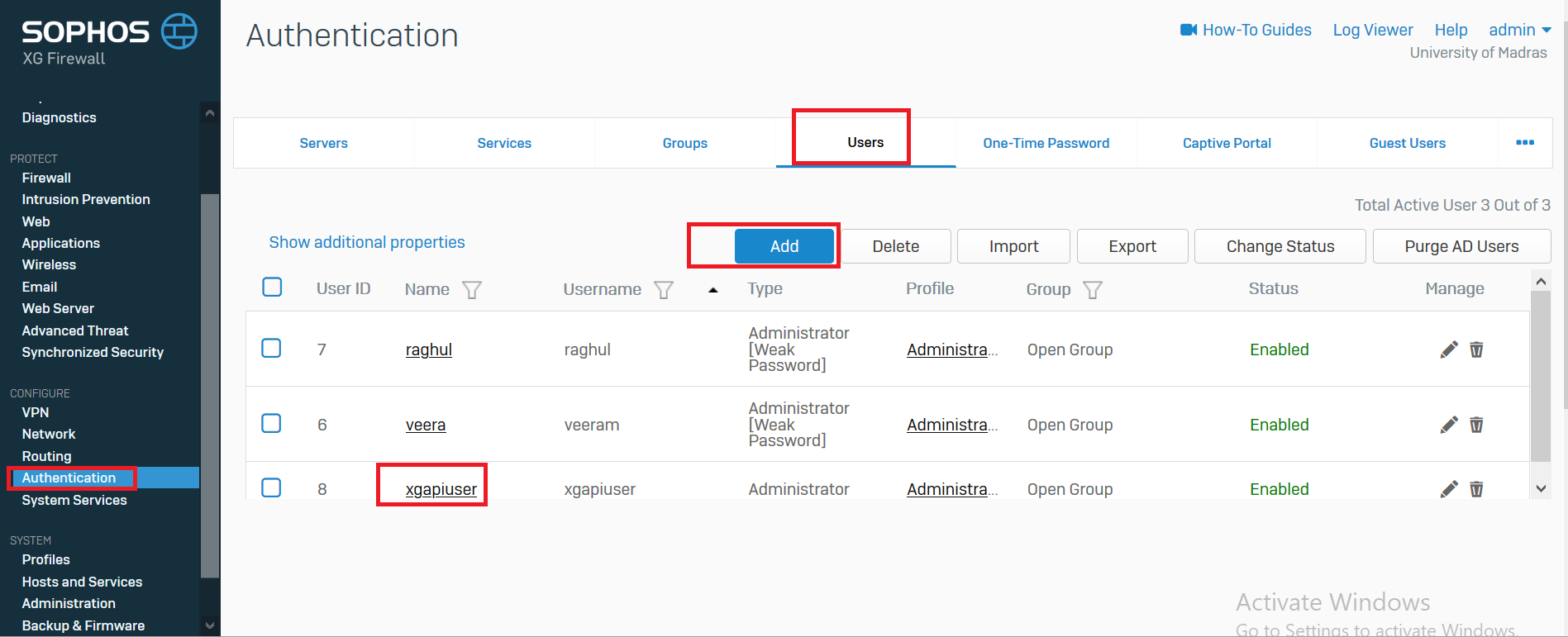 Go to Authentication > Users to create a new user for the API call. The user type will need to be Administrator and its profile will require read/write permissions. This API user is optional, its purpose is to lock the user down to certain rights in the XG, you can always use the Admin account.