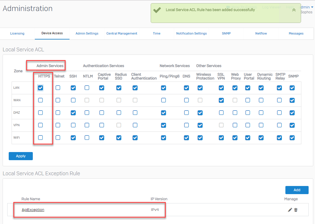 This IP address needs to be in a zone that has access to the HTTPS Admin Services, if not, it needs a Local Service ACL Exception Rule. Go to Administration > Device Access to verify its associated Zone .