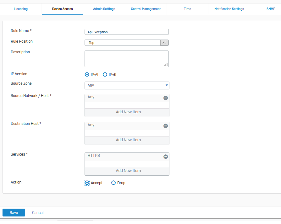 Then access below API URL in FWA service installed computer browser (Need to replace FIreallIP, USERNAME and PASSWORD values) : Sophos version 17 or older : https://FIreallIP:4444/webconsole/APIController?reqxml=<Request><Login><Username>USERNAME</Username><Password>PASSWORD</Password></Login><Get><SecurityPolicy></SecurityPolicy></Get></Request>