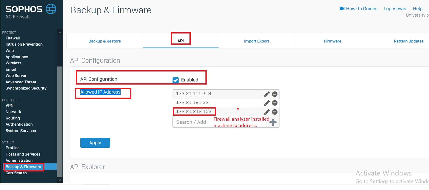 Go to Backup & Firmware > API to enable the API Configuration and need to add "Firewall Analyzer" installed machine ip address in "Allowed IP Address" field: